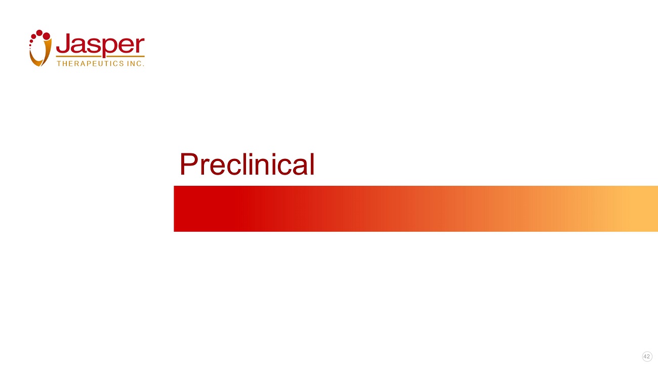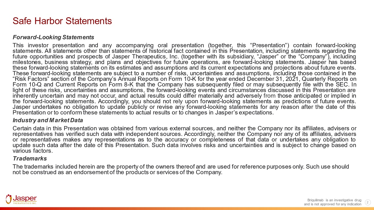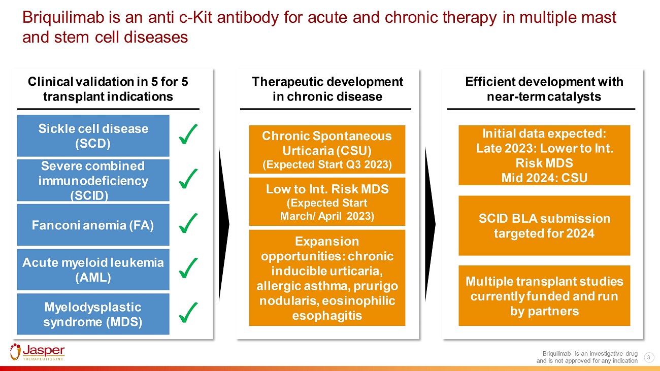 2 Briquilimab is an investigative drug and is not approved for any indication Safe Harbor Statements Forward - Looking Statements This investor presentation and any accompanying oral presentation (together, this “Presentation”) contain forward - looking statements . All statements other than statements of historical fact contained in this Presentation, including statements regarding the future opportunities and prospects of Jasper Therapeutics, Inc . (together with its subsidiary, “Jasper” or the “Company”), including milestones, business strategy, and plans and objectives for future operations, are forward - looking statements . Jasper has based these forward - looking statements on its estimates and assumptions and its current expectations and projections about future events . These forward - looking statements are subject to a number of risks, uncertainties and assumptions, including those contained in the “Risk Factors” section of the Company’s Annual Reports on Form 10 - K for the year ended December 31 , 2021 , Quarterly Reports on Form 10 - Q and Current Reports on Form 8 - K that the Company has subsequently filed or may subsequently file with the SEC . In light of these risks, uncertainties and assumptions, the forward - looking events and circumstances discussed in this Presentation are inherently uncertain and may not occur, and actual results could differ materially and adversely from those anticipated or implied in the forward - looking statements . Accordingly, you should not rely upon forward - looking statements as predictions of future events . Jasper undertakes no obligation to update publicly or revise any forward - looking statements for any reason after the date of this Presentation or to conform these statements to actual results or to changes in Jasper’s expectations . Industry and Market Data Certain data in this Presentation was obtained from various external sources, and neither the Company nor its affiliates, advisers or representatives has verified such data with independent sources . Accordingly, neither the Company nor any of its affiliates, advisers or representatives makes any representations as to the accuracy or completeness of that data or undertakes any obligation to update such data after the date of this Presentation . Such data involves risks and uncertainties and is subject to change based on various factors . Trademarks The trademarks included herein are the property of the owners thereof and are used for reference purposes only. Such use shou ld not be construed as an endorsement of the products or services of the Company.