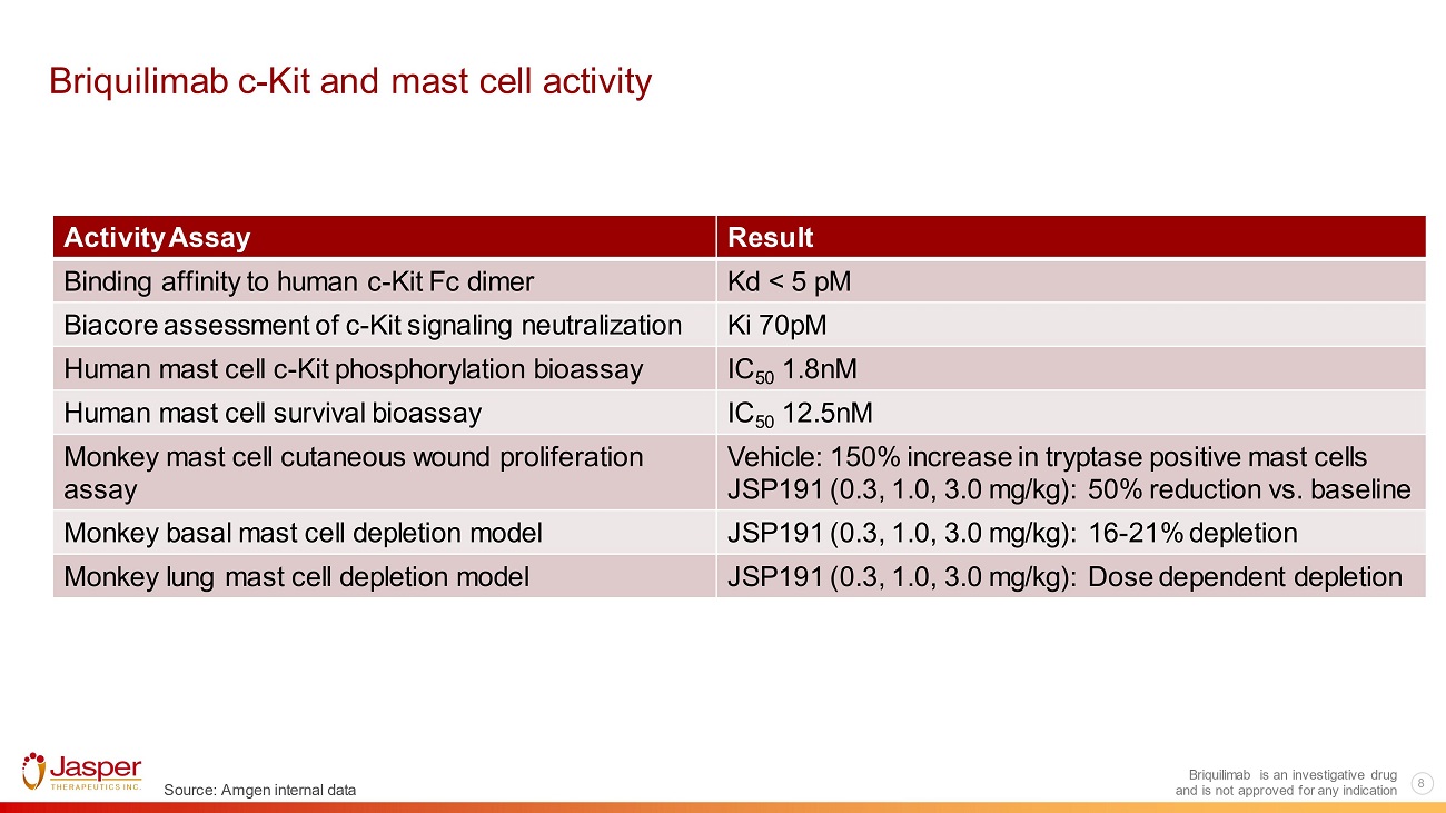 8 Briquilimab is an investigative drug and is not approved for any indication Briquilimab c - Kit and mast cell activity Activity Assay Result Binding affinity to human c - Kit Fc dimer Kd < 5 pM Biacore assessment of c - Kit signaling neutralization Ki 70pM Human mast cell c - Kit phosphorylation bioassay IC 50 1.8nM Human mast cell survival bioassay IC 50 12.5nM Monkey mast cell cutaneous wound proliferation assay Vehicle: 150% increase in tryptase positive mast cells JSP191 (0.3, 1.0, 3.0 mg/kg): 50% reduction vs. baseline Monkey basal mast cell depletion model JSP191 (0.3, 1.0, 3.0 mg/kg): 16 - 21% depletion Monkey lung mast cell depletion model JSP191 (0.3, 1.0, 3.0 mg/kg): Dose dependent depletion Source: Amgen internal data