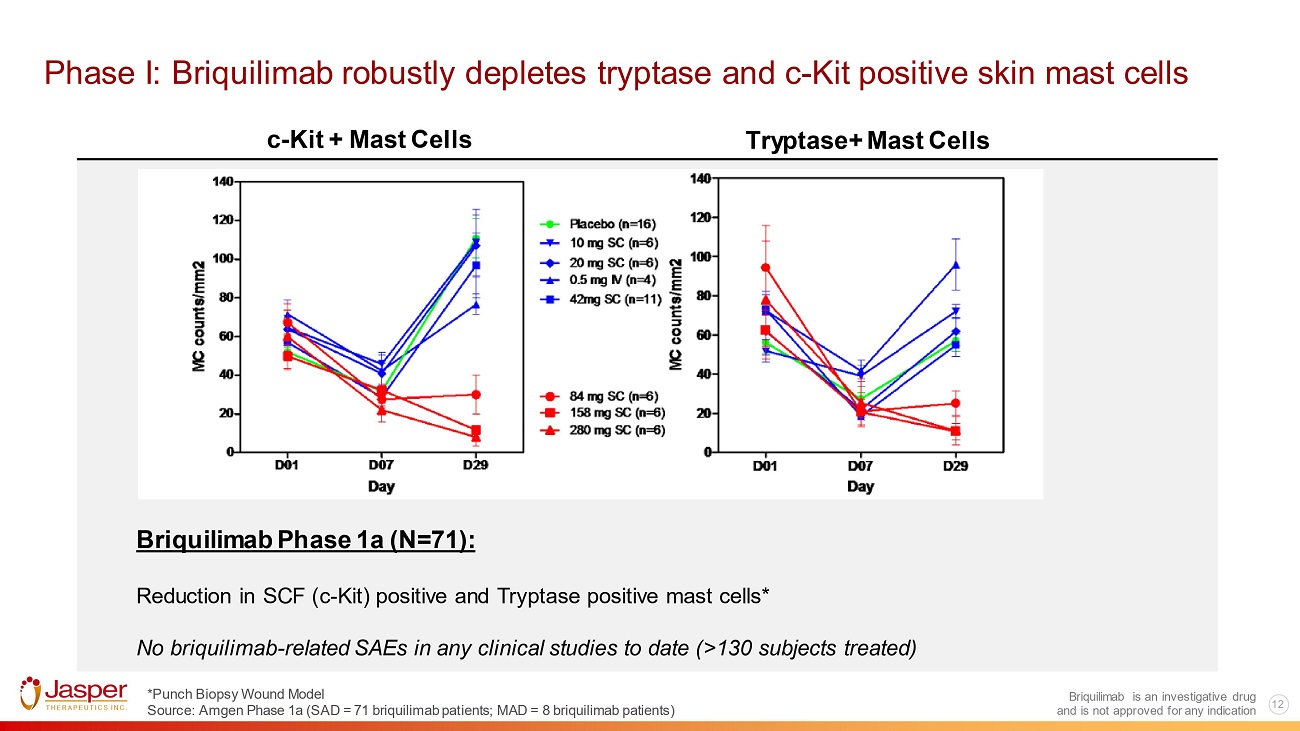 11 Briquilimab is an investigative drug and is not approved for any indication Briquilimab can be dosed IV or subcutaneously (SQ) Briquilimab IV serum concentrations Time (days) C o n c e n t r a t i o n o f J S P 1 9 1 i n S e r u m ( n g / m L ) 0 7 14 21 1 10 100 1000 10000 100000 -0001 (0.1 mg/kg) -0002 (0.1 mg/kg) -0003 (0.1 mg/kg) -0004 (0.3 mg/kg) -0006 (0.3 mg/kg) -0008 (0.3 mg/kg) -0013 (0.3 mg/kg) -0014 (0.3 mg/kg) -0015 (0.3 mg/kg) -0011 (0.6 mg/kg) -0007 (1 mg/kg) -0009 (1 mg/kg) -0010 (1 mg/kg) -0016 (0.6 mg/kg) Briquilimab subcutaneous serum concentrations Source: Jasper SCID Study, Amgen Phase I Study Data
