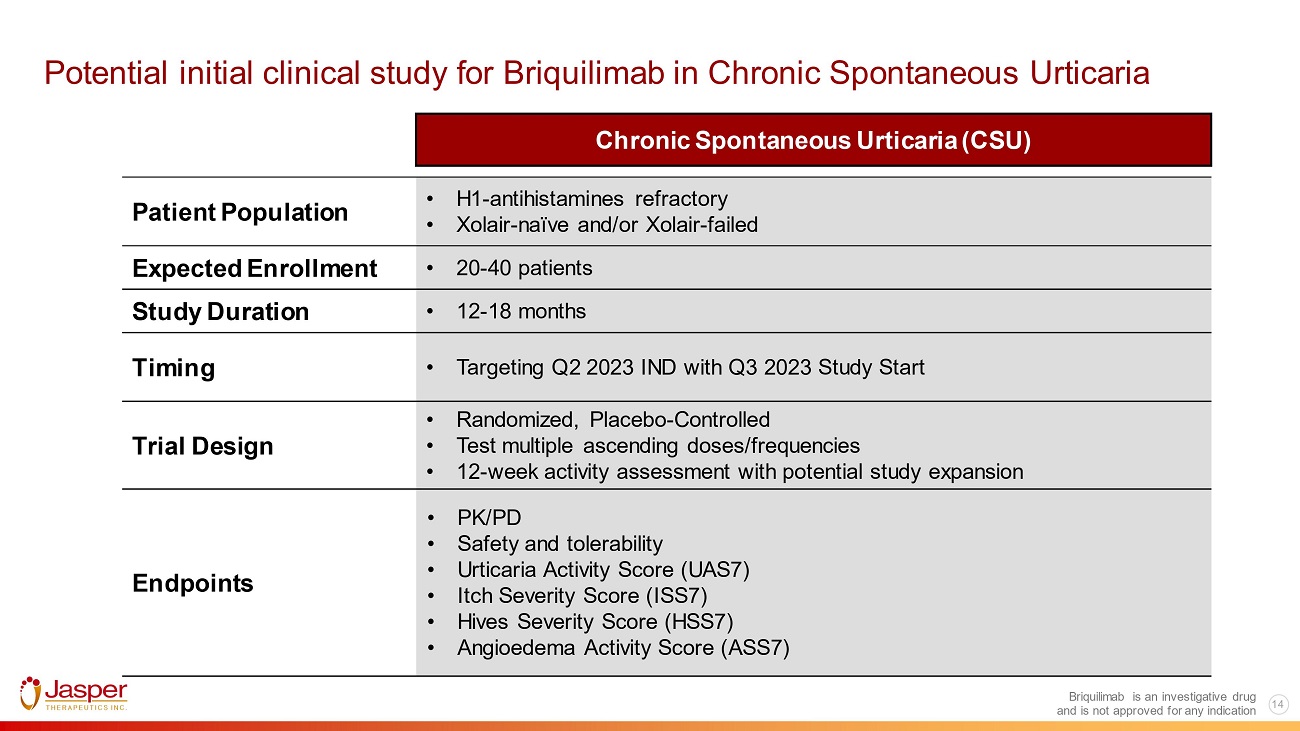 13 Briquilimab is an investigative drug and is not approved for any indication Celldex’s barzolvolimab has demonstrated proof - of - concept of c - Kit signal blockade for Chronic Spontaneous Urticaria patients Source: Celldex EAACI 2022 Presentation (June 30, 2022) Barzolvolimab Phase 1b MAD (IV) Shows Efficacy in Chronic Spontaneous Urticaria Patients