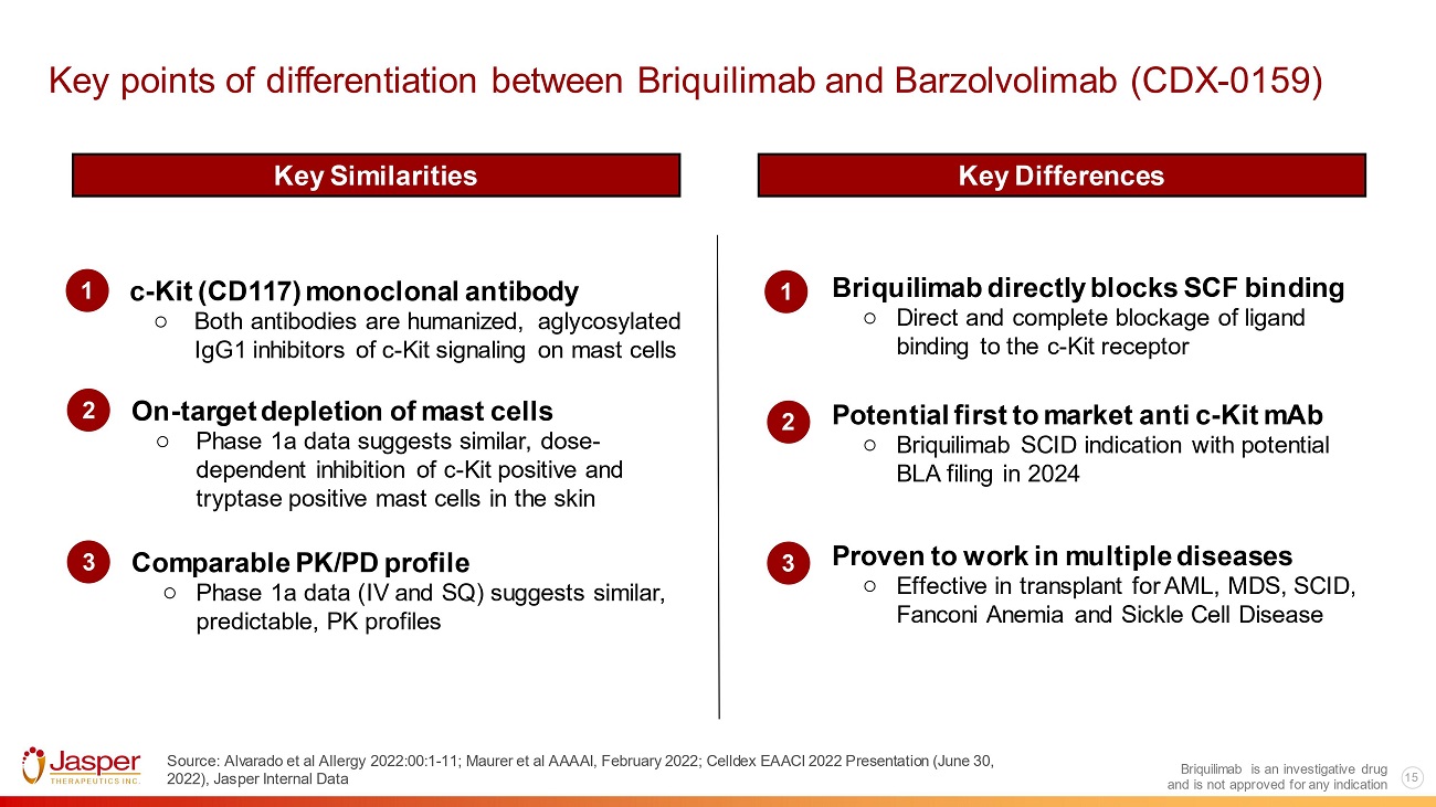 14 Briquilimab is an investigative drug and is not approved for any indication Potential initial clinical study for Briquilimab in Chronic Spontaneous Urticaria Chronic Spontaneous Urticaria (CSU) Patient Population • H1 - antihistamines refractory • Xolair - naïve and/or Xolair - failed Expected Enrollment • 20 - 40 patients Study Duration • 12 - 18 months Timing • Targeting Q2 2023 IND with Q3 2023 Study Start Trial Design • Randomized, Placebo - Controlled • Test multiple ascending doses/frequencies • 12 - week activity assessment with potential study expansion Endpoints • PK/PD • Safety and tolerability • Urticaria Activity Score (UAS7) • Itch Severity Score (ISS7) • Hives Severity Score (HSS7) • Angioedema Activity Score (ASS7)