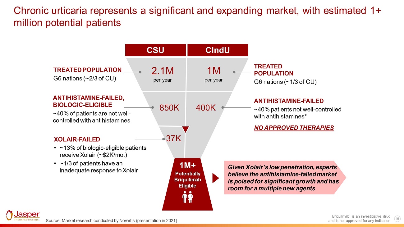 15 Briquilimab is an investigative drug and is not approved for any indication Key points of differentiation between Briquilimab and Barzolvolimab (CDX - 0159) Key Similarities Key Differences 1 c - Kit (CD117) monoclonal antibody o Both antibodies are humanized, aglycosylated IgG1 inhibitors of c - Kit signaling on mast cells 2 On - target depletion of mast cells o Phase 1a data suggests similar, dose - dependent inhibition of c - Kit positive and tryptase positive mast cells in the skin 3 Comparable PK/PD profile o Phase 1a data (IV and SQ) suggests similar, predictable, PK profiles 1 2 3 Potential first to market anti c - Kit mAb o Briquilimab SCID indication with potential BLA filing in 2024 Briquilimab directly blocks SCF binding o Direct and complete blockage of ligand binding to the c - Kit receptor Proven to work in multiple diseases o Effective in transplant for AML, MDS, SCID, Fanconi Anemia and Sickle Cell Disease Source: Alvarado et al Allergy 2022:00:1 - 11; Maurer et al AAAAI, February 2022; Celldex EAACI 2022 Presentation (June 30, 2022), Jasper Internal Data