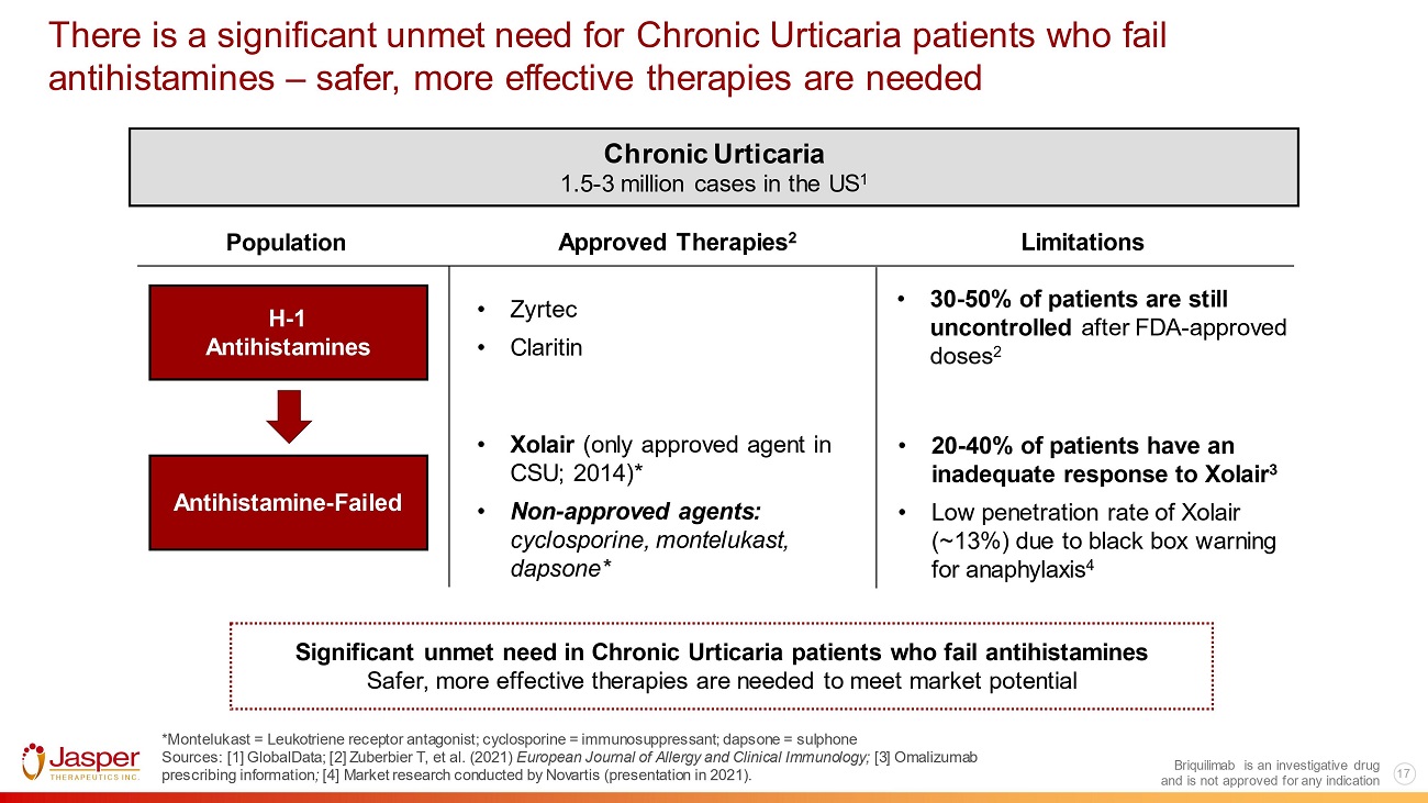 16 Briquilimab is an investigative drug and is not approved for any indication Chronic urticaria represents a significant and expanding market, with estimated 1+ million potential patients Given Xolair’s low penetration, experts believe the antihistamine - failed market is poised for significant growth and has room for a multiple new agents CSU CIndU 2.1M per year 1M per year TREATED POPULATION G6 nations (~1/3 of CU) TREATED POPULATION G6 nations (~2/3 of CU) 850K 400K ANTIHISTAMINE - FAILED ~40% patients not well - controlled with antihistamines* ANTIHISTAMINE - FAILED, BIOLOGIC - ELIGIBLE ~40% of patients are not well - controlled with antihistamines XOLAIR - FAILED • ~13% of biologic - eligible patients receive Xolair (~$2K/mo.) • ~1/3 of patients have an inadequate response to Xolair 37K NO APPROVED THERAPIES 1M+ Potentially Briquilimab Eligible Source: Market research conducted by Novartis (presentation in 2021)