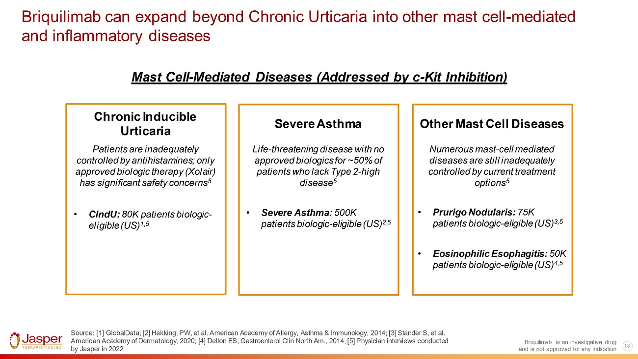 17 Briquilimab is an investigative drug and is not approved for any indication There is a significant unmet need for Chronic Urticaria patients who fail antihistamines – safer, more effective therapies are needed *Montelukast = Leukotriene receptor antagonist; cyclosporine = immunosuppressant; dapsone = sulphone Sources: [1] GlobalData; [2] Zuberbier T, et al. (2021) European Journal of Allergy and Clinical Immunology; [3] Omalizumab prescribing information ; [4] Market research conducted by Novartis (presentation in 2021). Chronic Urticaria 1.5 - 3 million cases in the US 1 H - 1 Antihistamines Antihistamine - Failed Population Approved Therapies 2 Limitations • Zyrtec • Claritin • Xolair (only approved agent in CSU; 2014)* • Non - approved agents: cyclosporine, montelukast, dapsone* • 30 - 50% of patients are still uncontrolled after FDA - approved doses 2 • 20 - 40% of patients have an inadequate response to Xolair 3 • Low penetration rate of Xolair (~13%) due to black box warning for anaphylaxis 4 Significant unmet need in Chronic Urticaria patients who fail antihistamines Safer, more effective therapies are needed to meet market potential