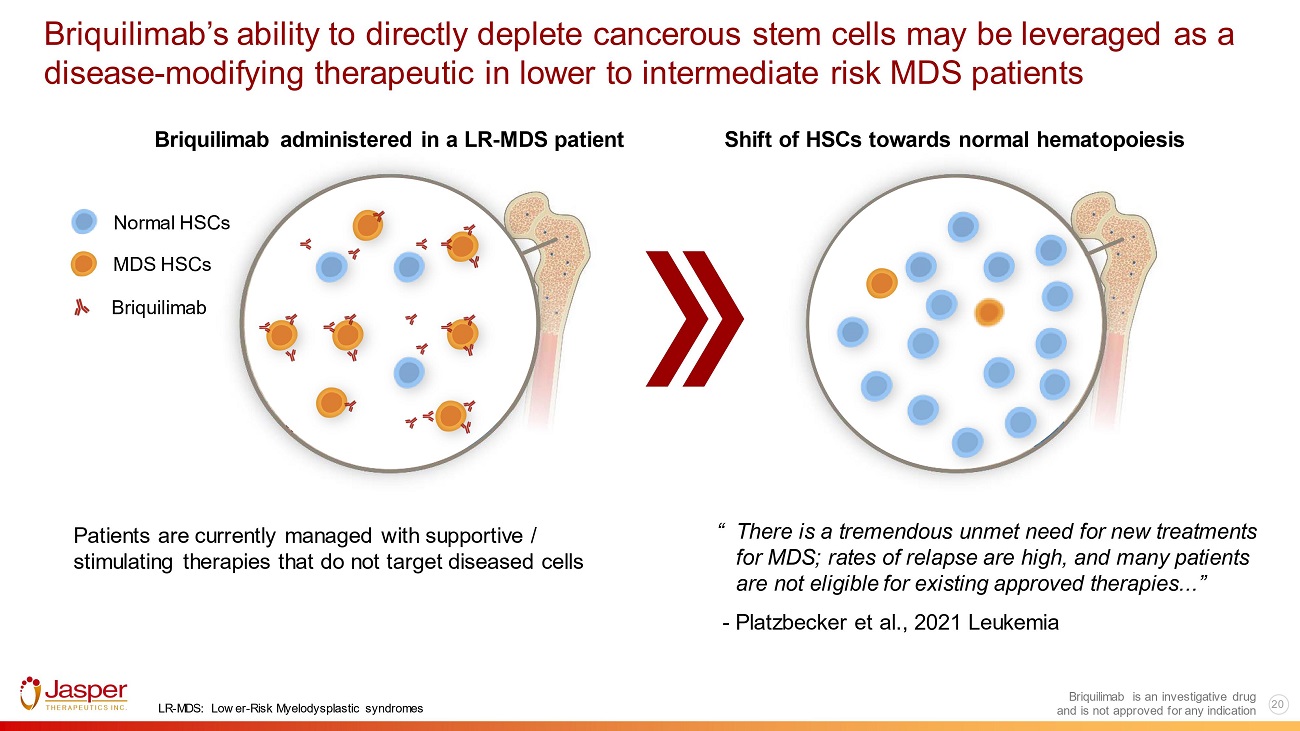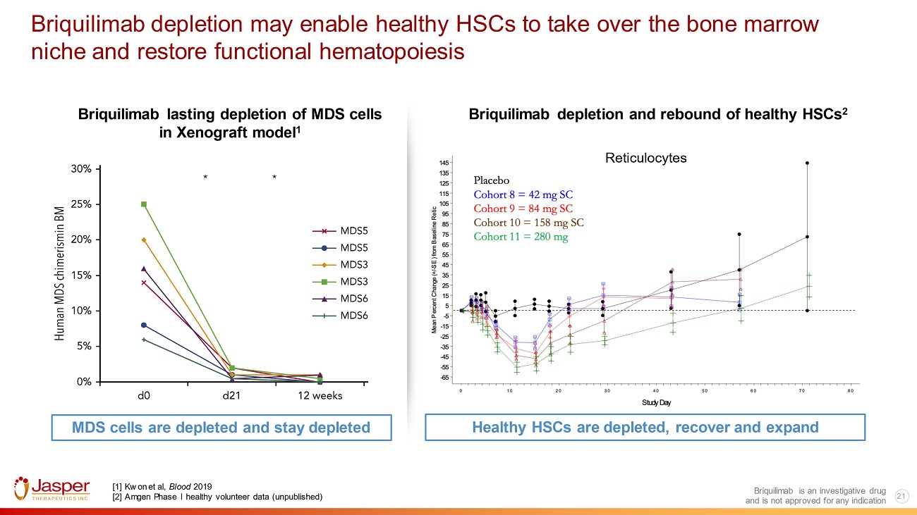 20 Briquilimab is an investigative drug and is not approved for any indication Briquilimab’s ability to directly deplete cancerous stem cells may be leveraged as a disease - modifying therapeutic in lower to intermediate risk MDS patients LR - MDS: Lower - Risk Myelodysplastic syndromes MDS HSCs Briquilimab Normal HSCs Briquilimab administered in a LR - MDS patient Shift of HSCs towards normal hematopoiesis P atient s are currently managed with supportive / stimulating therapies that do not target diseased cells - Platzbecker et al., 2021 Leukemia “ There is a tremendous unmet need for new treatments for MDS; rates of relapse are high, and many patients are not eligible for existing approved therapies...”