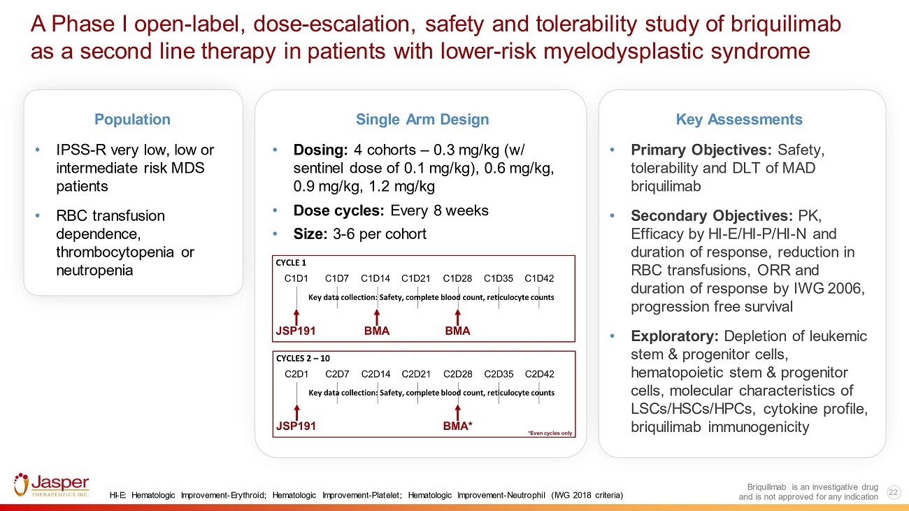 21 Briquilimab is an investigative drug and is not approved for any indication Briquilimab depletion may enable healthy HSCs to take over the bone marrow niche and restore functional hematopoiesis [1] Kwon et al, Blood 2019 [2] Amgen Phase I healthy volunteer data (unpublished) Briquilimab depletion and rebound of healthy HSCs 2 Reticulocytes MDS cells are depleted and stay depleted Healthy HSCs are depleted, recover and expand Briquilimab lasting depletion of MDS cells in Xenograft model 1