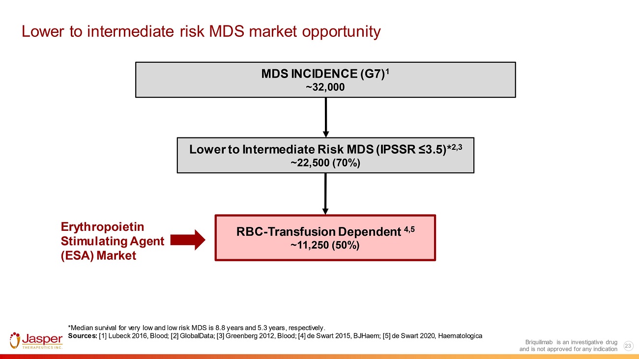 22 Briquilimab is an investigative drug and is not approved for any indication A Phase I open - label, dose - escalation, safety and tolerability study of briquilimab as a second line therapy in patients with lower - risk myelodysplastic syndrome HI - E: Hematologic Improvement - Erythroid; Hematologic Improvement - Platelet; Hematologic Improvement - Neutrophil (IWG 2018 criteria ) • Primary Objectives: Safety, tolerability and DLT of MAD briquilimab • Secondary Objectives: PK, Efficacy by HI - E/HI - P/HI - N and duration of response, reduction in RBC transfusions, ORR and duration of response by IWG 2006, progression free survival • Exploratory: Depletion of leukemic stem & progenitor cells, hematopoietic stem & progenitor cells, molecular characteristics of LSCs/HSCs/HPCs, cytokine profile, briquilimab immunogenicity Key Assessments Population • IPSS - R very low, low or intermediate risk MDS patients • RBC transfusion dependence, thrombocytopenia or neutropenia Single Arm Design • Dosing: 4 cohorts – 0.3 mg /kg (w/ sentinel dose of 0.1 mg /kg ), 0.6 mg /kg , 0.9 mg /kg , 1.2 mg /kg • Dose cycles: Every 8 weeks • Size: 3 - 6 per cohort