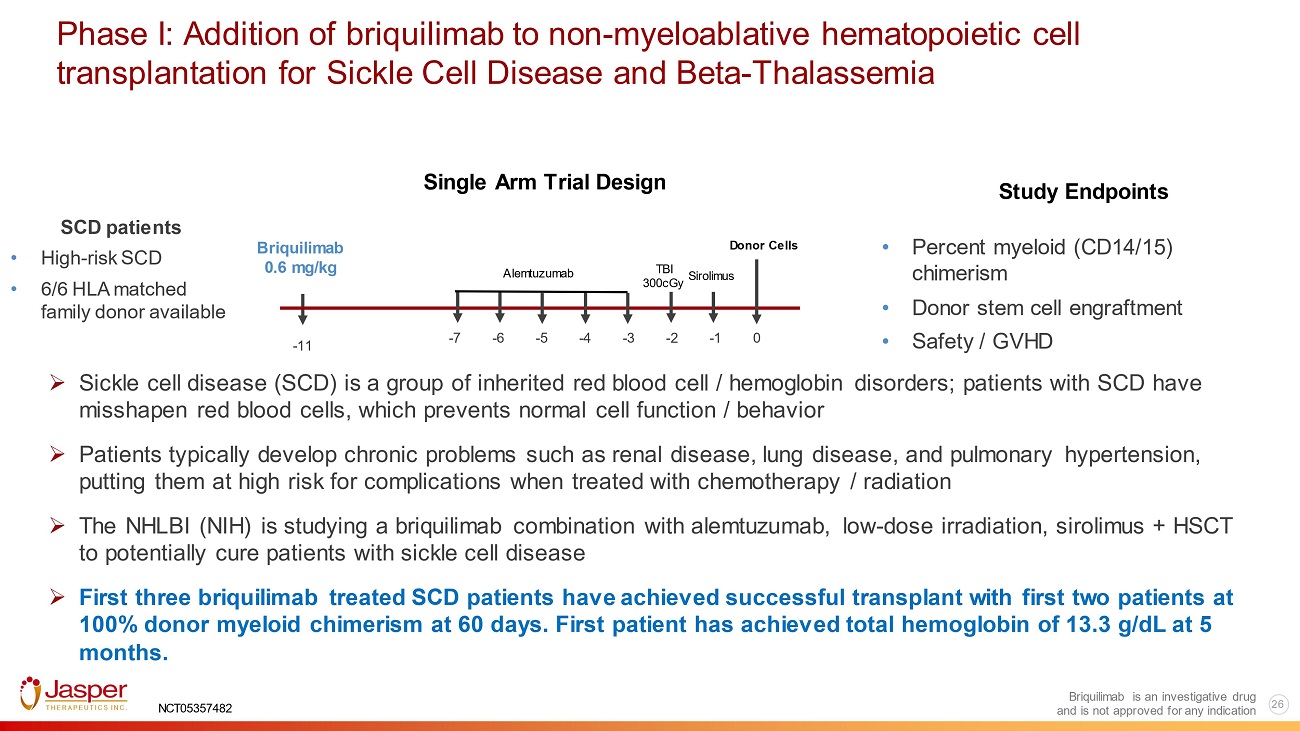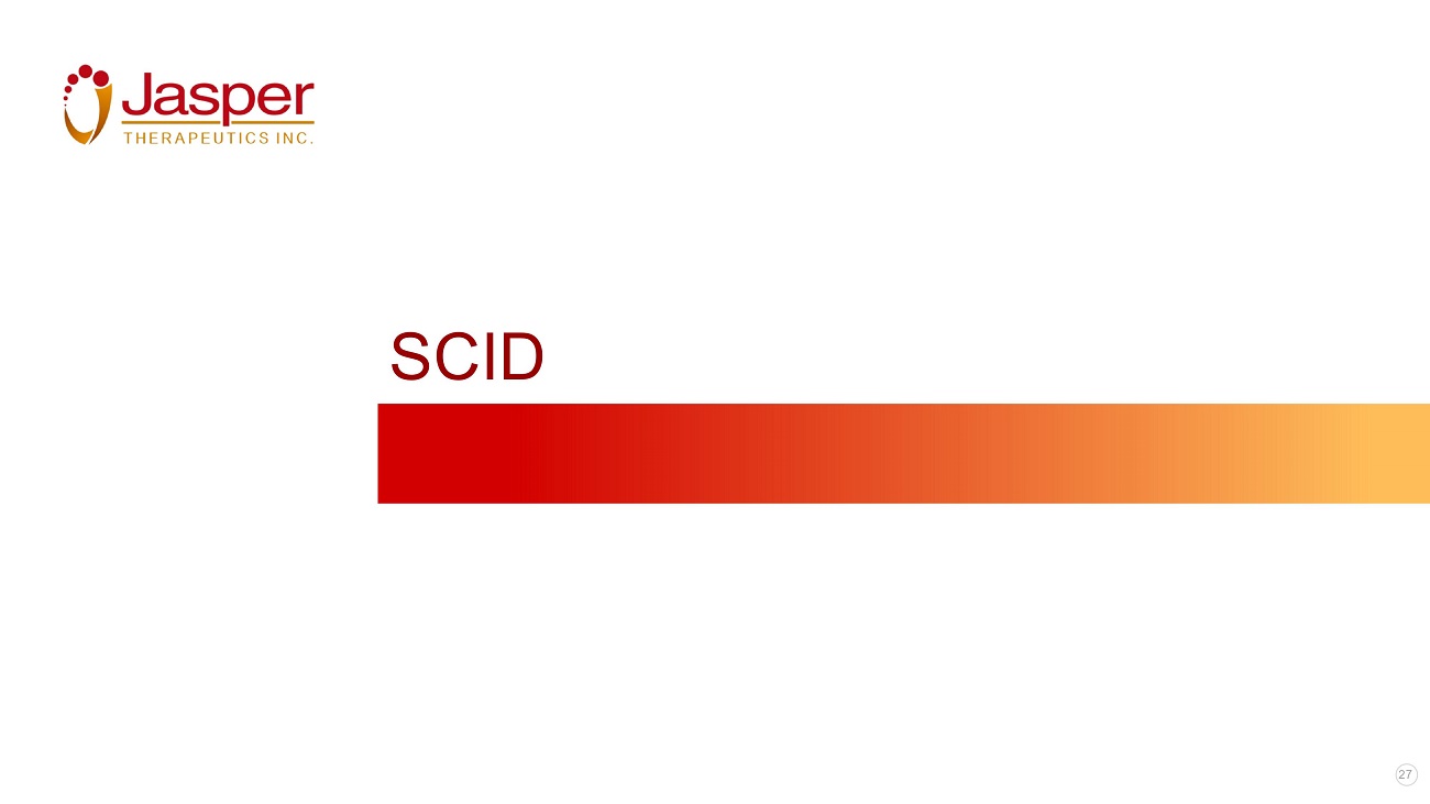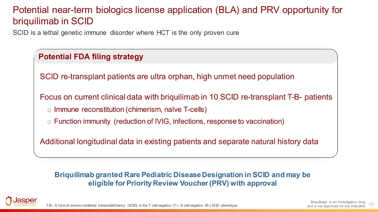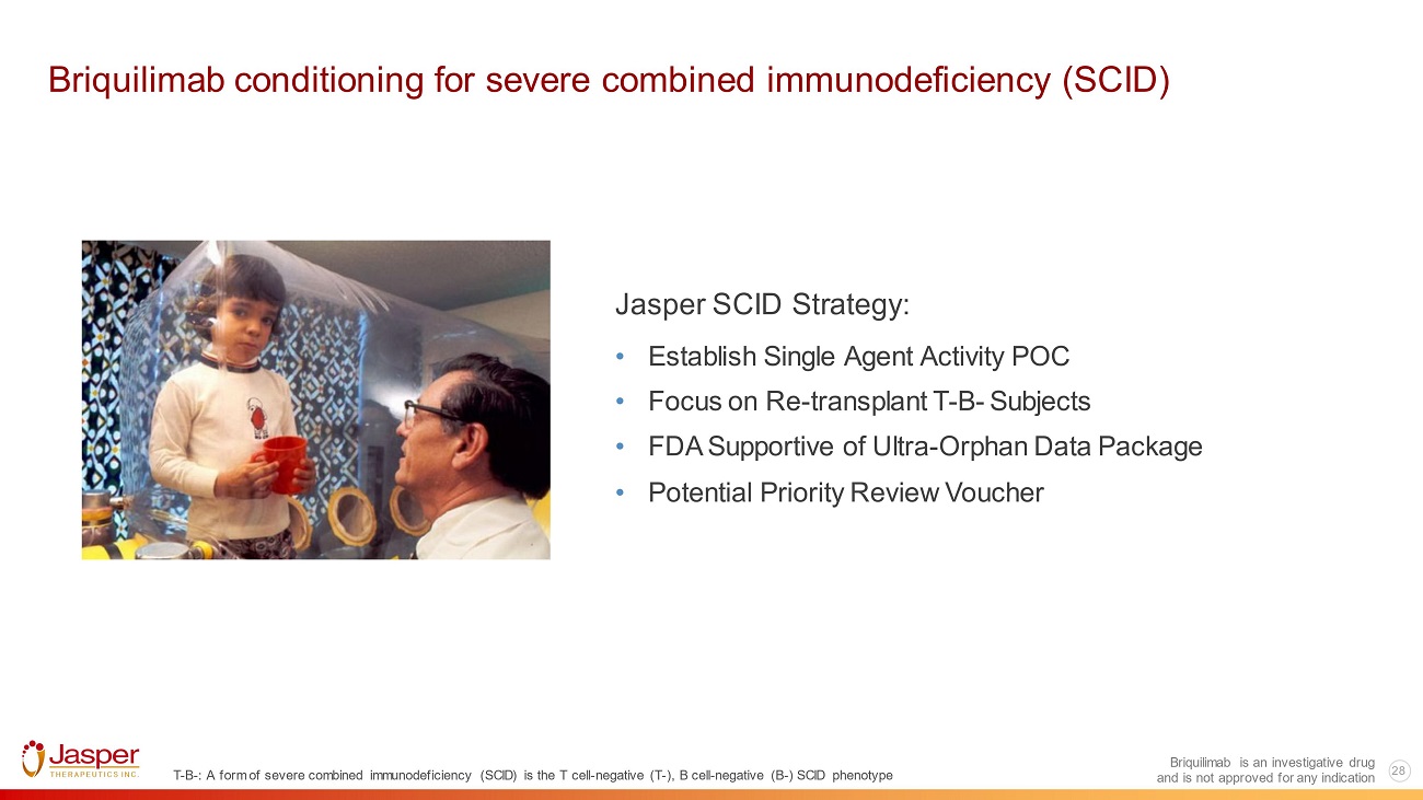 28 Briquilimab is an investigative drug and is not approved for any indication Briquilimab conditioning for severe combined immunodeficiency (SCID) T - B - : A form of severe combined immunodeficiency (SCID) is the T cell - negative (T - ), B cell - negative (B - ) SCID phenotype Jasper SCID Strategy: • Establish Single Agent Activity POC • Focus on Re - transplant T - B - Subjects • FDA Supportive of Ultra - Orphan Data Package • Potential Priority Review Voucher
