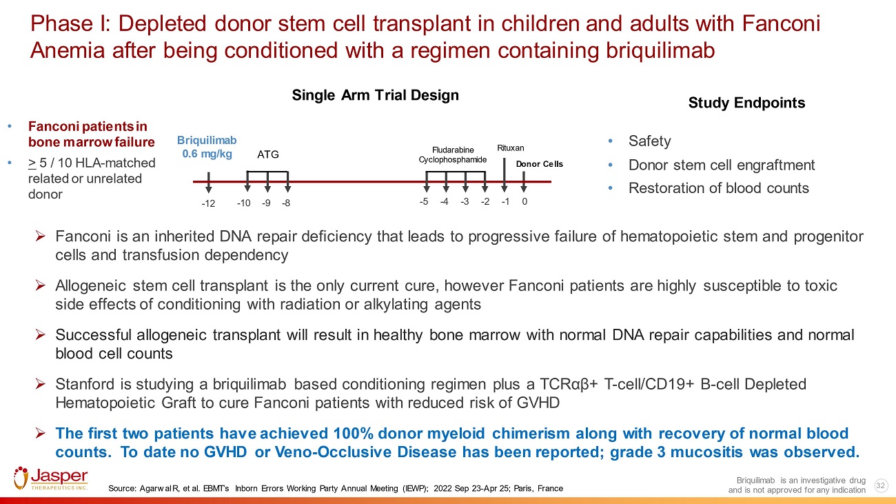 32 Briquilimab is an investigative drug and is not approved for any indication Fludarabine Cyclophosphamide » Fanconi is an inherited DNA repair deficiency that leads to progressive failure of hematopoietic stem and progenitor cells and transfusion dependency » Allogeneic stem cell transplant is the only current cure, however Fanconi patients are highly susceptible to toxic side effects of conditioning with radiation or alkylating agents » Successful allogeneic transplant will result in healthy bone marrow with normal DNA repair capabilities and normal blood cell counts » Stanford is studying a briquilimab based conditioning regimen plus a TCR αβ + T - cell/CD19+ B - cell Depleted Hematopoietic Graft to cure Fanconi patients with reduced risk of GVHD » The first two patients have achieved 100% donor myeloid chimerism along with recovery of normal blood counts. To date no GVHD or Veno - Occlusive Disease has been reported; grade 3 mucositis was observed. • Fanconi patients in bone marrow failure • > 5 / 10 HLA - matched related or unrelated donor • Safety • Donor stem cell engraftment • Restoration of blood counts Study Endpoints Single Arm Trial Design 0 - 12 - 10 - 9 - 8 - 1 - 2 - 3 - 4 - 5 Briquilimab 0.6 mg/kg Rituxan ATG Donor Cells Source: Agarwal R, et al. EBMT’s Inborn Errors Working Party Annual Meeting (IEWP); 2022 Sep 23 - Apr 25; Paris, France Phase I: Depleted donor stem cell transplant in children and adults with Fanconi Anemia after being conditioned with a regimen containing briquilimab