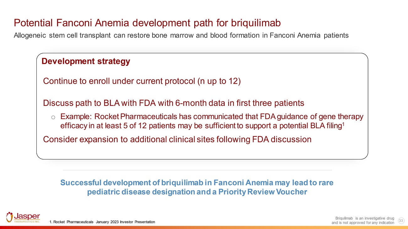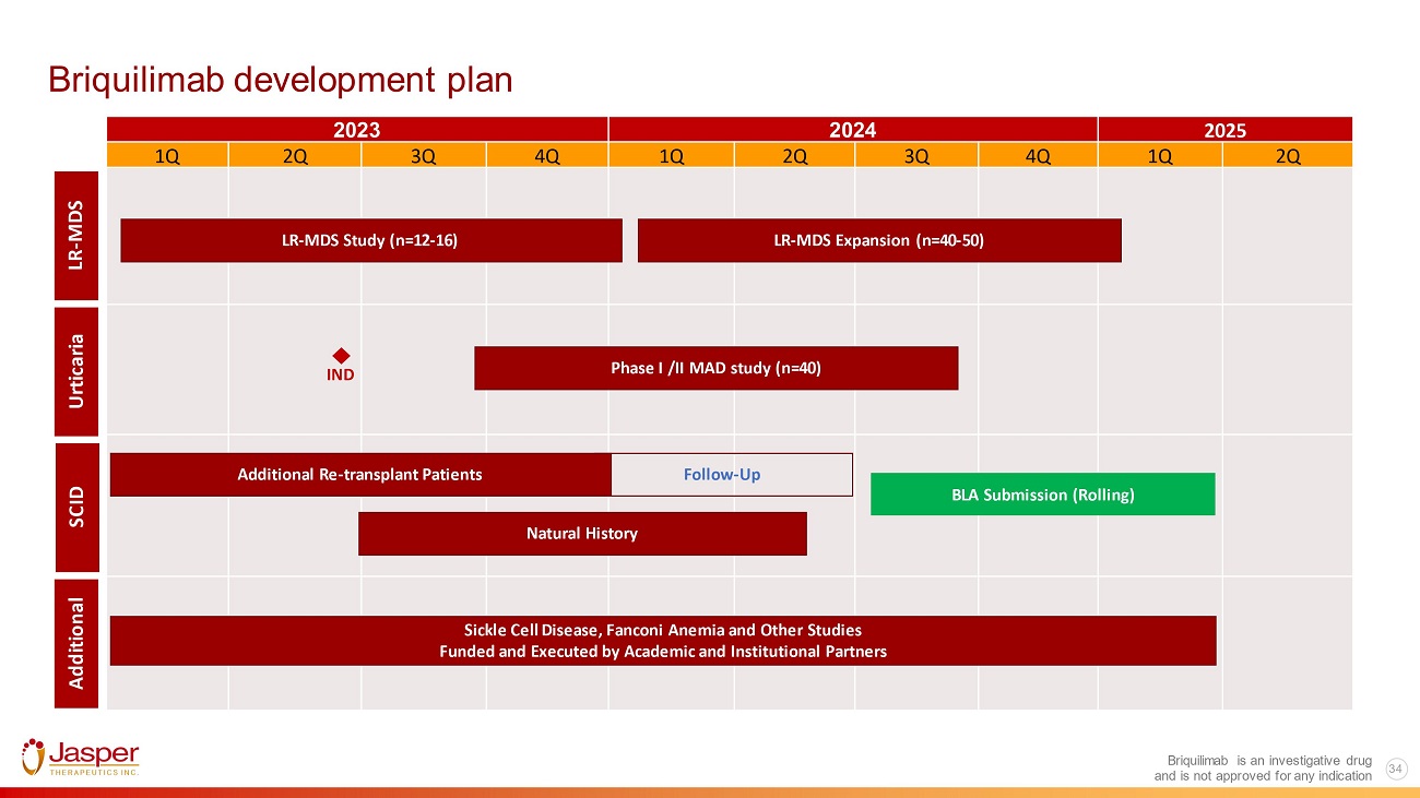 33 Briquilimab is an investigative drug and is not approved for any indication Potential Fanconi Anemia development path for briquilimab Continue to enroll under current protocol (n up to 12) Discuss path to BLA with FDA with 6 - month data in first three patients o Example: Rocket Pharmaceuticals has communicated that FDA guidance of gene therapy efficacy in at least 5 of 12 patients may be sufficient to support a potential BLA filing 1 Consider expansion to additional clinical sites following FDA discussion Allogeneic stem cell transplant can restore bone marrow and blood formation in Fanconi Anemia patients Development strategy Successful development of briquilimab in Fanconi Anemia may lead to rare pediatric disease designation and a Priority Review Voucher 1. Rocket Pharmaceuticals January 2023 Investor Presentation