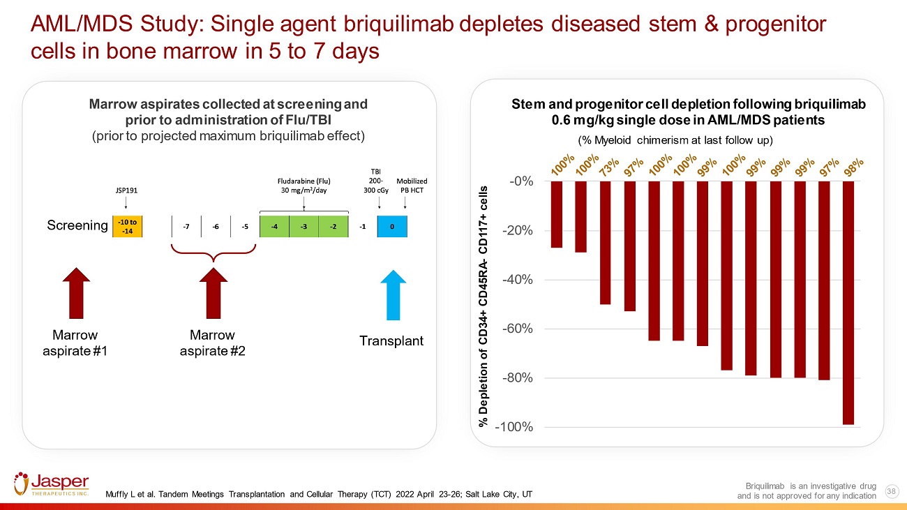 38 Briquilimab is an investigative drug and is not approved for any indication AML/MDS Study: Single agent briquilimab depletes diseased stem & progenitor cells in bone marrow in 5 to 7 days Stem and progenitor cell depletion following briquilimab 0.6 mg/kg single dose in AML/MDS patients Muffly L et al. Tandem Meetings Transplantation and Cellular Therapy (TCT) 2022 April 23 - 26; Salt Lake City, UT Screening Marrow aspirate #2 Marrow aspirates collected at screening and prior to administration of Flu/TBI (prior to projected maximum briquilimab effect) Marrow aspirate #1 Transplant -0% -20% -40% -60% -80% -100% % Depletion of CD34+ CD45RA - CD117+ cells (% Myeloid chimerism at last follow up)