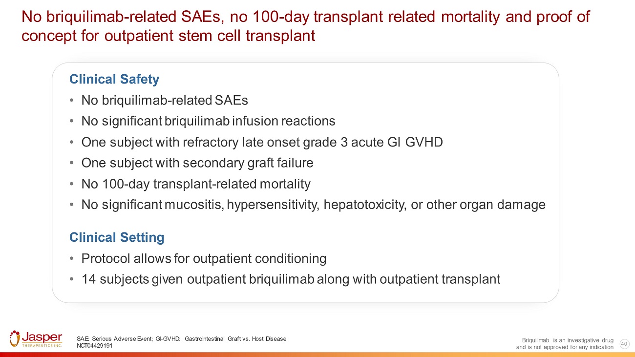 39 Briquilimab is an investigative drug and is not approved for any indication Briquilimab based conditioning demonstrates donor cell takeover of bone marrow stem cells and elimination of detectable cancer in older patients (Median donor chimerism) Clearance of detectable cancer Donor cell takeover of the bone marrow (Measurable residual disease by flow cytometry) 82% 18% Briquilimab /Flu/TBI n=11 100% MRD Positive MRD Negative 56% 44% Flu/TBI n=41 1 100% MRD positive MRD negative 0 285690 180 360 0 20 40 60 80 100 Days after HSCT % D o n o r d e r i v e d i n t o t a l P B M C Total Chimerism 0 285690 180 360 0 20 40 60 80 100 Days after HSCT % D o n o r d e r i v e d i n C D 3 + c e l l s T Cell Chimerism 0 285690 180 360 0 20 40 60 80 100 Days after HSCT % D o n o r d e r i v e d i n C D 1 5 + c e l l s Myeloid Chimerism Phase 1a (200 cGy TBI) Phase 1b (300 cGy TBI) 0003 0004 0005 0009 0010 0011 0018 0013 0016 0017 0020 0021 0024 0025 0022 0030 0031 0033 0036 0037 0038 0034 0035 0040 Percent donor CD15+ cells 0 285690 180 360 0 20 40 60 80 100 Days after HSCT % D o n o r d e r i v e d i n t o t a l P B M C Total Chimerism 0 285690 180 360 0 20 40 60 80 100 Days after HSCT % D o n o r d e r i v e d i n C D 3 + c e l l s T Cell Chimerism 0 285690 180 360 0 20 40 60 80 100 Days after HSCT % D o n o r d e r i v e d i n C D 1 5 + c e l l s Myeloid Chimerism Phase 1a (200 cGy TBI) Phase 1b (300 cGy TBI) 0003 0004 0005 0009 0010 0011 0018 0013 0016 0017 0020 0021 0024 0025 0022 0030 0031 0033 0036 0037 0038 0034 0035 0040 Percent donor CD3+ cells [1] Paras G, Morsink LM, Othus M, et al. Conditioning intensity and peritransplant flow cytometric MRD dynamics in adult AML. Blood. 2022;139(11):1694 - 1706