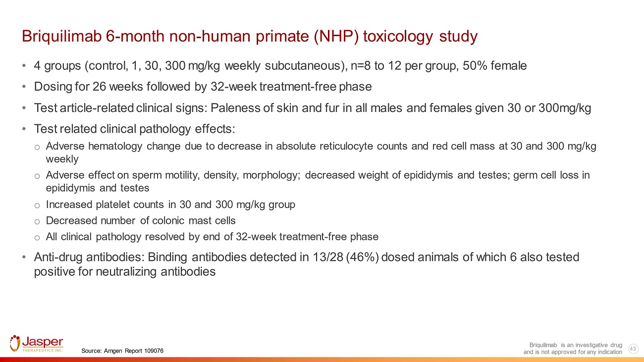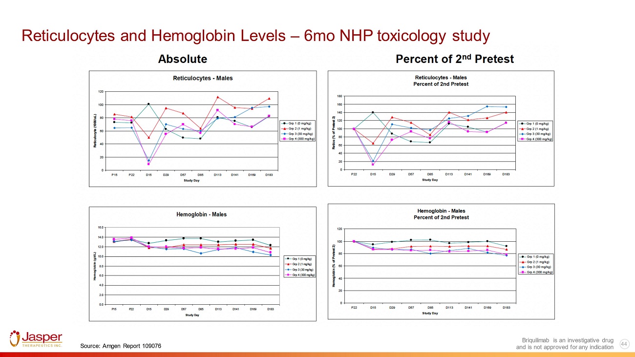 43 Briquilimab is an investigative drug and is not approved for any indication Briquilimab 6 - month non - human primate (NHP) toxicology study • 4 groups (control, 1, 30, 300 mg/kg weekly subcutaneous), n=8 to 12 per group, 50% female • Dosing for 26 weeks followed by 32 - week treatment - free phase • Test article - related clinical signs: Paleness of skin and fur in all males and females given 30 or 300mg/kg • Test related clinical pathology effects: o Adverse hematology change due to decrease in absolute reticulocyte counts and red cell mass at 30 and 300 mg/kg weekly o Adverse effect on sperm motility, density, morphology; decreased weight of epididymis and testes; germ cell loss in epididymis and testes o Increased platelet counts in 30 and 300 mg/kg group o Decreased number of colonic mast cells o All clinical pathology resolved by end of 32 - week treatment - free phase • Anti - drug antibodies: Binding antibodies detected in 13/28 (46%) dosed animals of which 6 also tested positive for neutralizing antibodies Source: Amgen Report 109076
