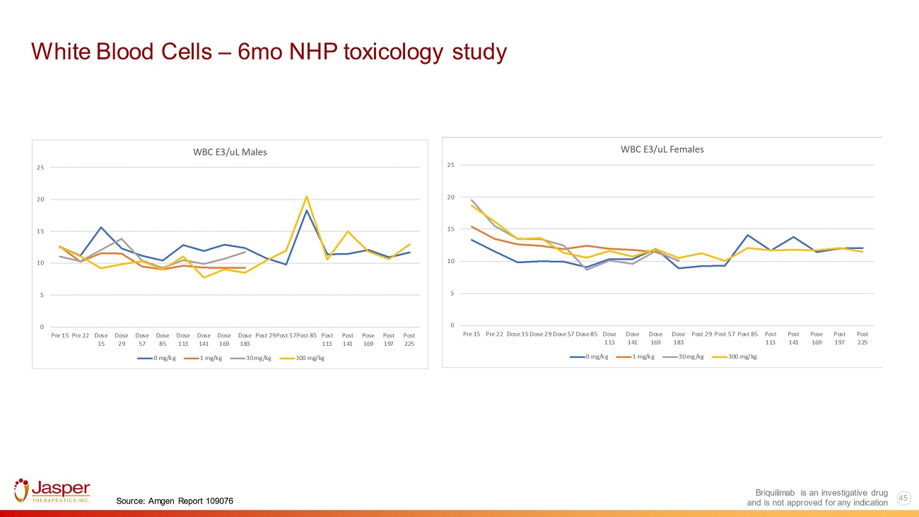 44 Briquilimab is an investigative drug and is not approved for any indication Reticulocytes and Hemoglobin Levels – 6mo NHP toxicology study Source: Amgen Report 109076
