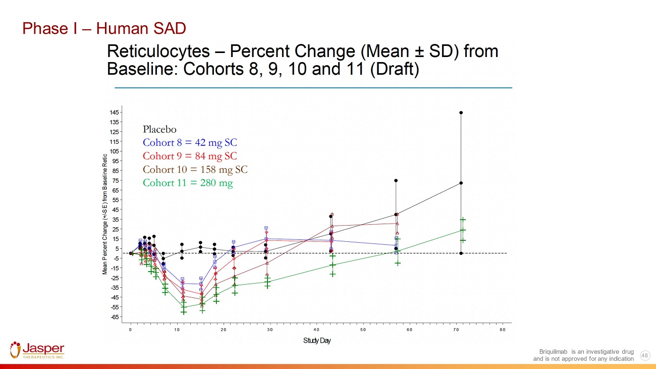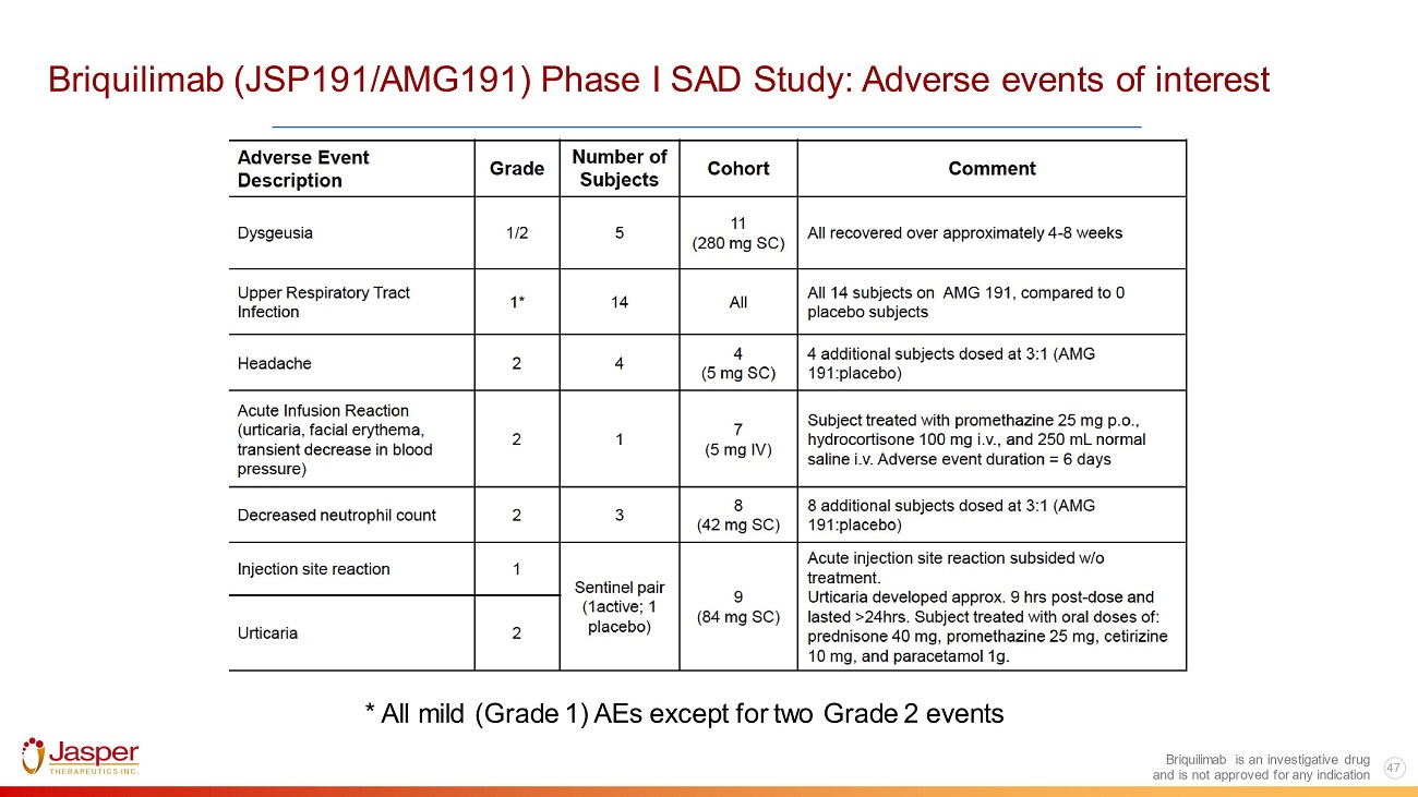 47 Briquilimab is an investigative drug and is not approved for any indication * All mild (Grade 1) AEs except for two Grade 2 events Briquilimab (JSP191/AMG191) Phase I SAD Study: Adverse events of interest