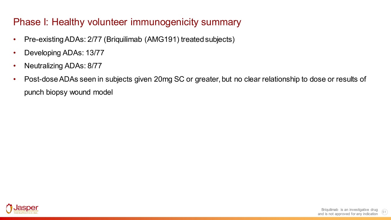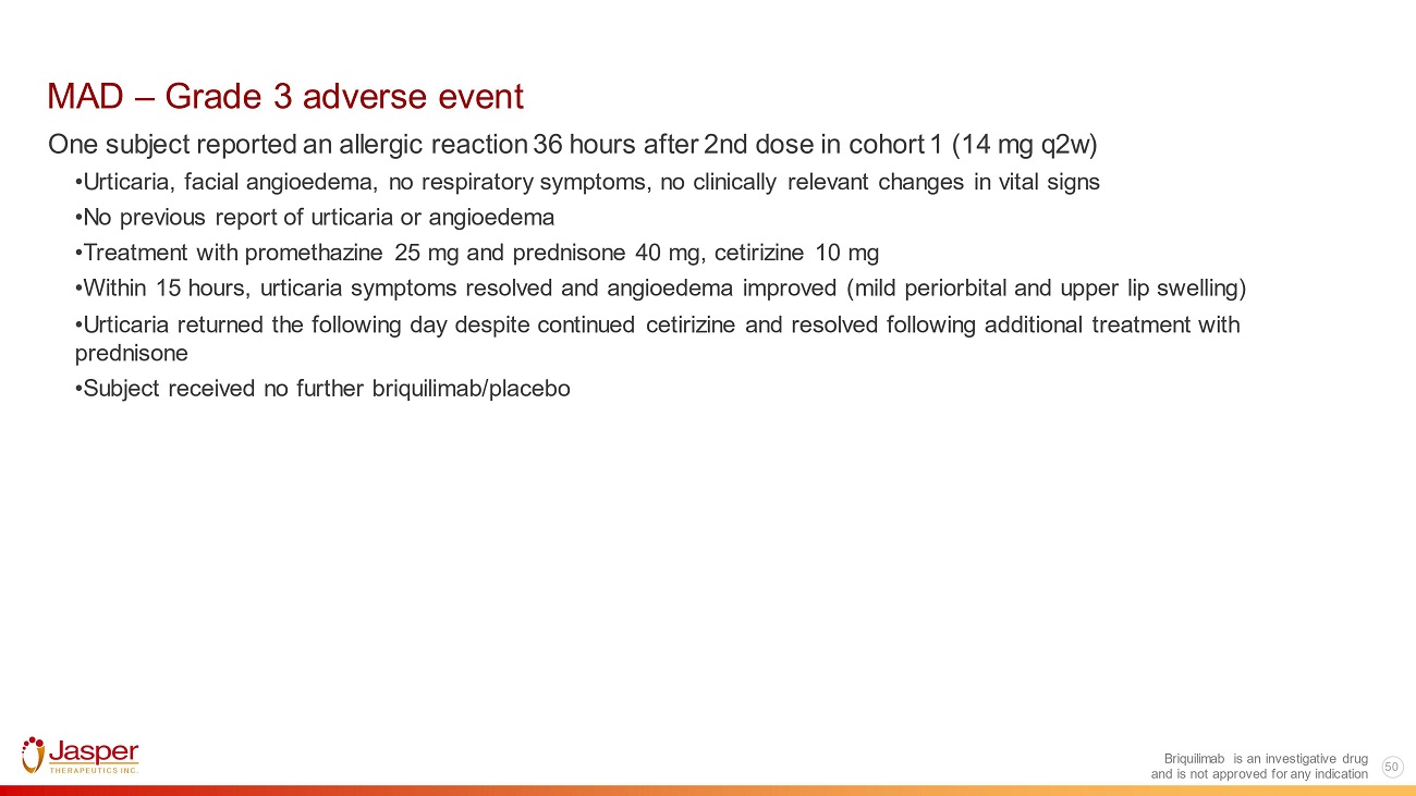 50 Briquilimab is an investigative drug and is not approved for any indication MAD – Grade 3 adverse event One subject reported an allergic reaction 36 hours after 2nd dose in cohort 1 (14 mg q2w) •Urticaria, facial angioedema, no respiratory symptoms, no clinically relevant changes in vital signs •No previous report of urticaria or angioedema •Treatment with promethazine 25 mg and prednisone 40 mg, cetirizine 10 mg •Within 15 hours, urticaria symptoms resolved and angioedema improved (mild periorbital and upper lip swelling) •Urticaria returned the following day despite continued cetirizine and resolved following additional treatment with prednisone •Subject received no further b riquilimab /placebo