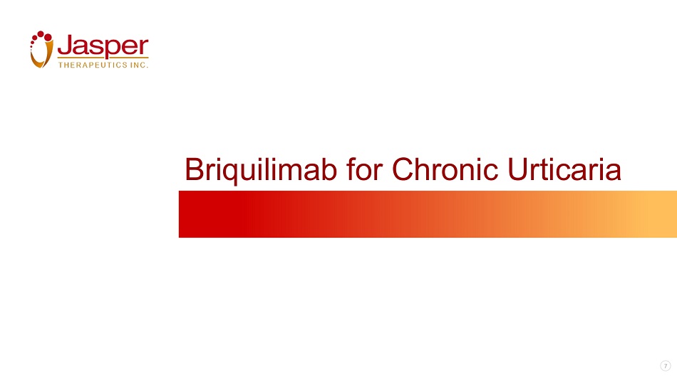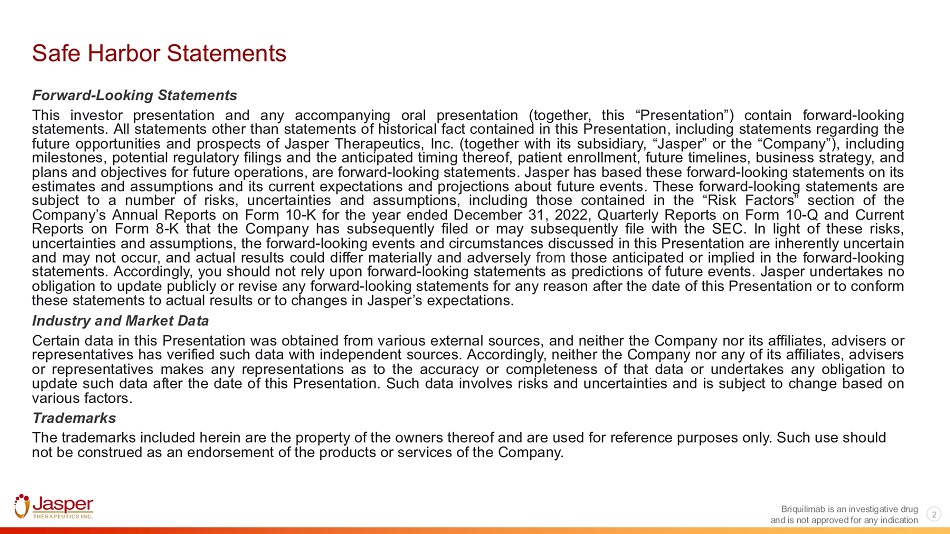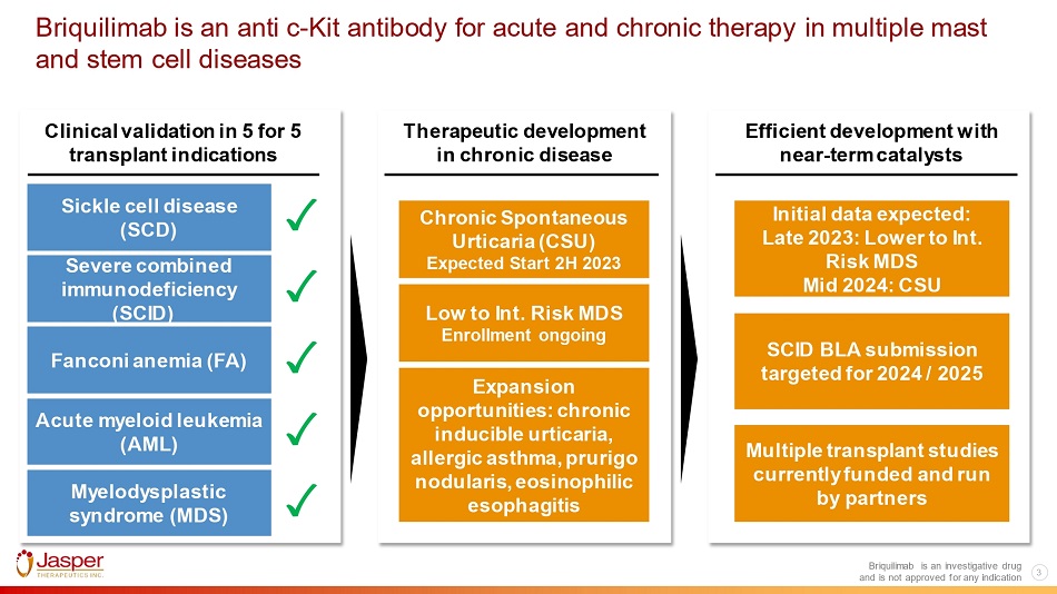 Safe Harbor Statements Briquilimab is an investigative drug and is not approved for any indication 2 Forward - Looking Statements This investor presentation and any accompanying oral presentation (together, this “Presentation”) contain forward - looking statements . All statements other than statements of historical fact contained in this Presentation, including statements regarding the future opportunities and prospects of Jasper Therapeutics, Inc . (together with its subsidiary, “Jasper” or the “Company”), including milestones, potential regulatory filings and the anticipated timing thereof, patient enrollment, future timelines, business strategy, and plans and objectives for future operations, are forward - looking statements . Jasper has based these forward - looking statements on its estimates and assumptions and its current expectations and projections about future events . These forward - looking statements are subject to a number of risks, uncertainties and assumptions, including those contained in the “Risk Factors” section of the Company’s Annual Reports on Form 10 - K for the year ended December 31 , 2022 , Quarterly Reports on Form 10 - Q and Current Reports on Form 8 - K that the Company has subsequently filed or may subsequently file with the SEC . In light of these risks, uncertainties and assumptions, the forward - looking events and circumstances discussed in this Presentation are inherently uncertain and may not occur, and actual results could differ materially and adversely from those anticipated or implied in the forward - looking statements . Accordingly, you should not rely upon forward - looking statements as predictions of future events . Jasper undertakes no obligation to update publicly or revise any forward - looking statements for any reason after the date of this Presentation or to conform these statements to actual results or to changes in Jasper’s expectations . Industry and Market Data Certain data in this Presentation was obtained from various external sources, and neither the Company nor its affiliates, advisers or representatives has verified such data with independent sources . Accordingly, neither the Company nor any of its affiliates, advisers or representatives makes any representations as to the accuracy or completeness of that data or undertakes any obligation to update such data after the date of this Presentation . Such data involves risks and uncertainties and is subject to change based on various factors . Trademarks The trademarks included herein are the property of the owners thereof and are used for reference purposes only. Such use should not be construed as an endorsement of the products or services of the Company.