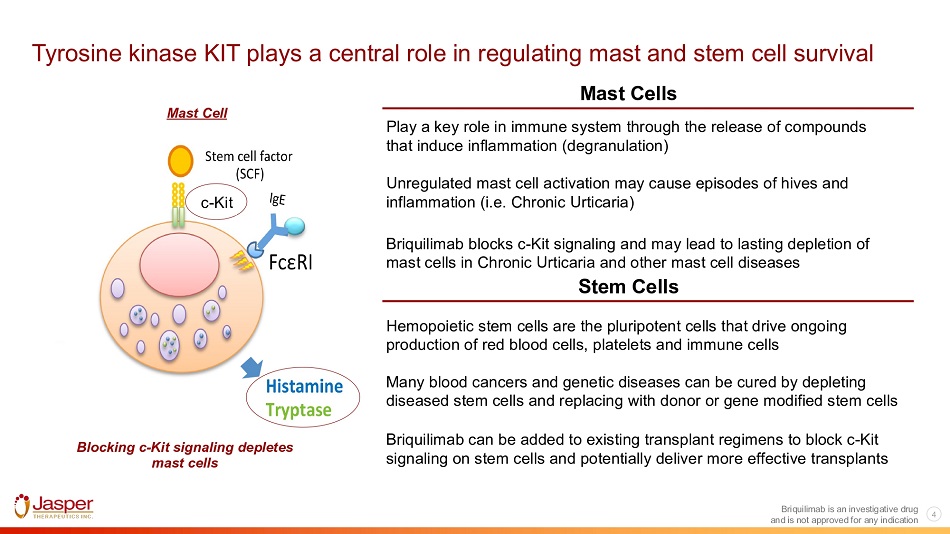 Briquilimab is an anti c - Kit antibody for acute and chronic therapy in multiple mast and stem cell diseases Clinical validation in 5 for 5 transplant indications Therapeutic development in chronic disease Chronic Spontaneous Urticaria (CSU) Expected Start Q4 2023 Low to Int. Risk MDS Enrollment ongoing Expansion opportunities: chronic inducible urticaria, allergic asthma, prurigo nodularis, eosinophilic esophagitis Efficient development with near - term catalysts Sickle cell disease (SCD) Severe combined immunodeficiency (SCID)_ Fanconi anemia (FA) Acute myeloid leukemia (AML) Myelodysplastic syndrome (MDS) Initial data expected: Late 2023: Lower to Int. Risk MDS Mid 2024: CSU Briquilimab is an investigative drug and is not approved for any indication 3 SCID BLA submission targeted for 2024 / 2025 Multiple transplant studies currently funded and run by partners