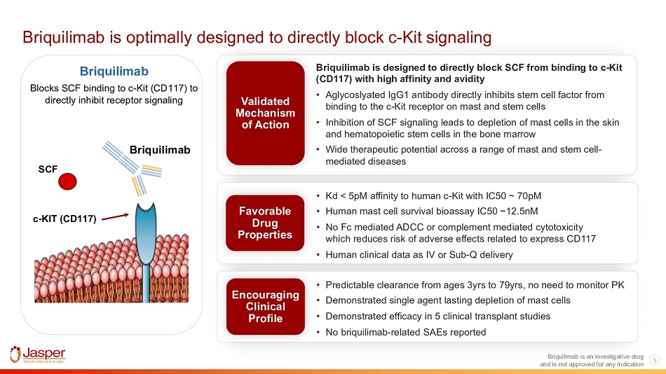 Tyrosine kinase KIT plays a central role in regulating mast and stem cell survival Play a key role in immune system through the release of compounds that induce inflammation (degranulation) Unregulated mast cell activation may cause episodes of hives and inflammation (i.e. Chronic Urticaria) Mast Cells Briquilimab blocks c - Kit signaling and may lead to lasting depletion of mast cells in Chronic Urticaria and other mast cell diseases Stem Cells Hemopoietic stem cells are the pluripotent cells that drive ongoing production of red blood cells, platelets and immune cells Many blood cancers and genetic diseases can be cured by depleting diseased stem cells and replacing with donor or gene modified stem cells Briquilimab can be added to existing transplant regimens to block c - Kit signaling on stem cells and potentially deliver more effective transplants Mast Cell Blocking c - Kit signaling depletes Briquilimab is an investigative drug and is not approved for any indication 4 mast cells c - Kit