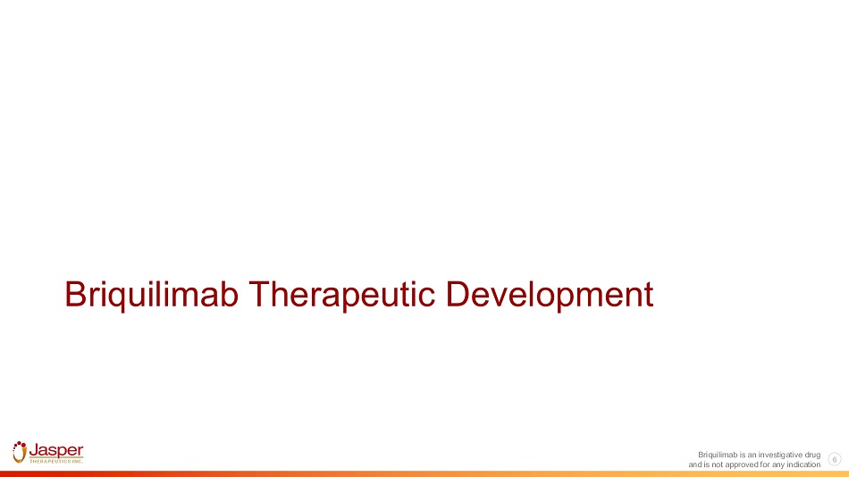 SCF c - KIT (CD117) Briquilimab Briquilimab Blocks SCF binding to c - Kit (CD117) to directly inhibit receptor signaling Validated Mechanism of Action Briquilimab is designed to directly block SCF from binding to c - Kit (CD117) with high affinity and avidity • Aglycoslyated IgG1 antibody directly inhibits stem cell factor from binding to the c - Kit receptor on mast and stem cells • Inhibition of SCF signaling leads to depletion of mast cells in the skin and hematopoietic stem cells in the bone marrow • Wide therapeutic potential across a range of mast and stem cell - mediated diseases Favorable Drug Properties • Kd < 5pM affinity to human c - Kit with IC50 ~ 70pM • Human mast cell survival bioassay IC50 ~12.5nM • No Fc mediated ADCC or complement mediated cytotoxicity which reduces risk of adverse effects related to express CD117 • Human clinical data as IV or Sub - Q delivery Encouraging Clinical Profile Briquilimab is an investigative drug and is not approved for any indication 5 • Predictable clearance from ages 3yrs to 79yrs, no need to monitor PK • Demonstrated single agent lasting depletion of mast cells • Demonstrated efficacy in 5 clinical transplant studies • No briquilimab - related SAEs reported Briquilimab is optimally designed to directly block c - Kit signaling