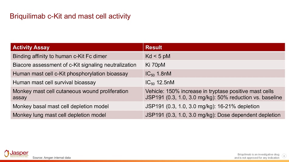 8 Briquilimab is an investigative drug and is not approved for any indication Briquilimab c - Kit and mast cell activity Result Activity Assay Kd < 5 pM Binding affinity to human c - Kit Fc dimer Ki 70pM Biacore assessment of c - Kit signaling neutralization IC 50 1.8nM Human mast cell c - Kit phosphorylation bioassay IC 50 12.5nM Human mast cell survival bioassay Vehicle: 150% increase in tryptase positive mast cells JSP191 (0.3, 1.0, 3.0 mg/kg): 50% reduction vs. baseline Monkey mast cell cutaneous wound proliferation assay JSP191 (0.3, 1.0, 3.0 mg/kg): 16 - 21% depletion Monkey basal mast cell depletion model JSP191 (0.3, 1.0, 3.0 mg/kg): Dose dependent depletion Monkey lung mast cell depletion model Source: Amgen internal data