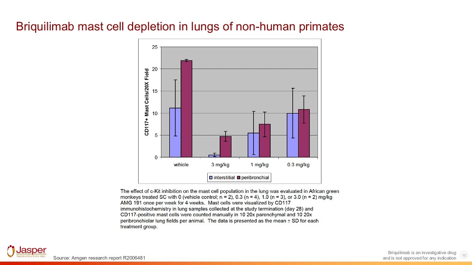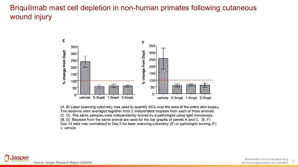 9 Briquilimab is an investigative drug Source: Amgen Research Report 2006488 Briquilimab mast cell depletion in non - human primates following cutaneous wound injury and is not approved for any indication