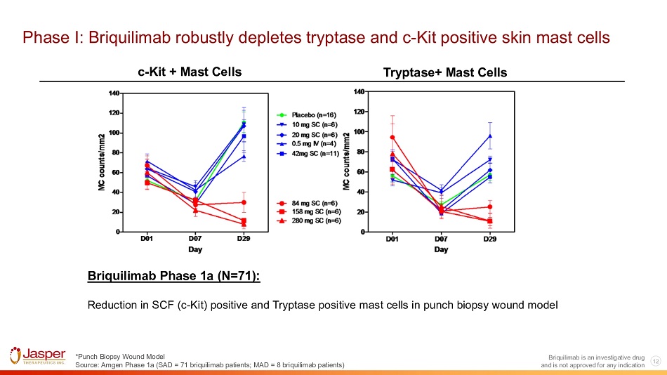 Briquilimab can be dosed IV or subcutaneously (SQ) Briquilimab IV serum concentrations Concentration of JSP191 in Serum (ng/mL) 0 7 14 Time (days) 21 1 10 100 1000 10000 100000 - 0001 (0.1 mg/kg) - 0002 (0.1 mg/kg) - 0003 (0.1 mg/kg) - 0004 (0.3 mg/kg) - 0006 (0.3 mg/kg) - 0008 (0.3 mg/kg) - 0013 (0.3 mg/kg) - 0014 (0.3 mg/kg) - 0015 (0.3 mg/kg) - 0011 (0.6 mg/kg) - 0016 (0.6 mg/kg) - 0007 (1 mg/kg) - 0009 (1 mg/kg) - 0010 (1 mg/kg) Briquilimab subcutaneous serum concentrations Briquilimab is an investigative drug and is not approved for any indication 11 Source: Jasper SCID Study, Amgen Phase I Study Data