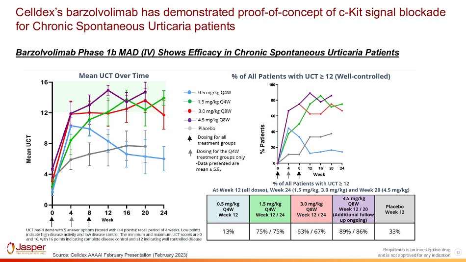 12 Briquilimab is an investigative drug and is not approved for any indication Phase I: Briquilimab robustly depletes tryptase and c - Kit positive skin mast cells *Punch Biopsy Wound Model Source: Amgen Phase 1a (SAD = 71 briquilimab patients; MAD = 8 briquilimab patients) Briquilimab Phase 1a (N=71): Reduction in SCF (c - Kit) positive and Tryptase positive mast cells in punch biopsy wound model c - Kit + Mast Cells Tryptase+ Mast Cells