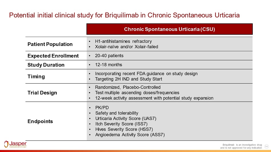 13 Briquilimab is an investigative drug and is not approved for any indication Celldex’s barzolvolimab has demonstrated proof - of - concept of c - Kit signal blockade for Chronic Spontaneous Urticaria patients Source: Celldex AAAAI February Presentation (February 2023) Barzolvolimab Phase 1b MAD (IV) Shows Efficacy in Chronic Spontaneous Urticaria Patients