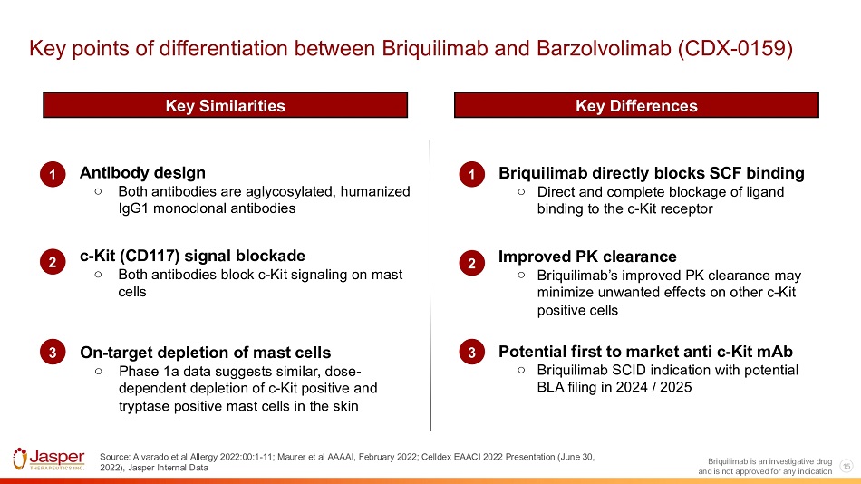14 Briquilimab is an investigative drug Potential initial clinical study for Briquilimab in Chronic Spontaneous Urticaria Chronic Spontaneous Urticaria (CSU) • H1 - antihistamines refractory • Xolair - naïve and/or Xolair - failed Patient Population • 20 - 40 patients Expected Enrollment • 12 - 18 months Study Duration • Incorporating recent FDA guidance on study design • Targeting Q3 2023 IND with Q4 2023 Study Start Timing • Randomized, Placebo - Controlled • Test multiple ascending doses/frequencies • 12 - week activity assessment with potential study expansion Trial Design • PK/PD • Safety and tolerability • Urticaria Activity Score (UAS7) • Itch Severity Score (ISS7) • Hives Severity Score (HSS7) • Angioedema Activity Score (ASS7) Endpoints and is not approved for any indication