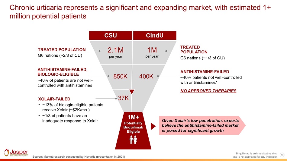 15 Briquilimab is an investigative drug and is not approved for any indication Key points of differentiation between Briquilimab and Barzolvolimab (CDX - 0159) Key Similarities Key Differences 1 c. Kit (CD117) signal blockade o Both antibodies block c - Kit signaling on mast cells 2 On - target depletion of mast cells o Phase 1a data suggests similar, dose - dependent depletion of c - Kit positive and tryptase positive mast cells in the skin 3 1 2 3 Potential first to market anti c - Kit mAb o Briquilimab SCID indication with potential BLA filing in 2024 / 2025 Briquilimab directly blocks SCF binding o Direct and complete blockage of ligand binding to the c - Kit receptor Improved PK clearance o Briquilimab’s improved PK clearance may minimize unwanted effects on other c - Kit positive cells Source: Alvarado et al Allergy 2022:00:1 - 11; Maurer et al AAAAI, February 2022; Celldex EAACI 2022 Presentation (June 30, 2022), Jasper Internal Data Antibody design o Both antibodies are aglycosylated, humanized IgG1 monoclonal antibodies
