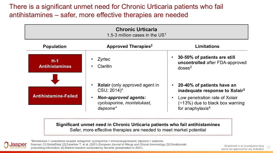 16 Briquilimab is an investigative drug and is not approved for any indication Chronic urticaria represents a significant and expanding market, with estimated 1+ million potential patients Given Xolair’s low penetration, experts believe the antihistamine - failed market is poised for significant growth CSU CIndU 2.1M per year 1M per year TREATED POPULATION G6 nations (~1/3 of CU) TREATED POPULATION G6 nations (~2/3 of CU) 850K 400K ANTIHISTAMINE - FAILED, BIOLOGIC - ELIGIBLE ~40% of patients are not well - controlled with antihistamines XOLAIR - FAILED • ~13% of biologic - eligible patients receive Xolair (~$2K/mo.) • ~1/3 of patients have an inadequate response to Xolair 37K ANTIHISTAMINE - FAILED ~40% patients not well - controlled with antihistamines* NO APPROVED THERAPIES 1M+ Potentially Briquilimab Eligible Source: Market research conducted by Novartis (presentation in 2021)