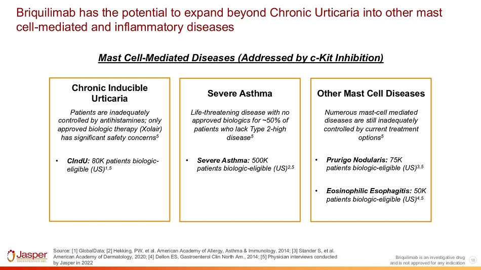 17 Briquilimab is an investigative drug and is not approved for any indication There is a significant unmet need for Chronic Urticaria patients who fail antihistamines – safer, more effective therapies are needed *Montelukast = Leukotriene receptor antagonist; cyclosporine = immunosuppressant; dapsone = sulphone Sources: [1] GlobalData; [2] Zuberbier T, et al. (2021) European Journal of Allergy and Clinical Immunology; [3] Omalizumab prescribing information ; [4] Market research conducted by Novartis (presentation in 2021). Chronic Urticaria 1.5 - 3 million cases in the US 1 H - 1 Antihistamines Antihistamine - Failed Population Approved Therapies 2 Limitations • Zyrtec • Claritin • Xolair (only approved agent in CSU; 2014)* • Non - approved agents: cyclosporine, montelukast, dapsone* • 30 - 50% of patients are still uncontrolled after FDA - approved doses 2 • 20 - 40% of patients have an inadequate response to Xolair 3 • Low penetration rate of Xolair (~13%) due to black box warning for anaphylaxis 4 Significant unmet need in Chronic Urticaria patients who fail antihistamines Safer, more effective therapies are needed to meet market potential
