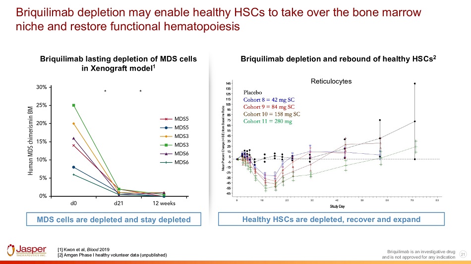 20 Briquilimab is an investigative drug and is not approved for any indication Briquilimab’s ability to directly deplete cancerous stem cells may be leveraged as a disease - modifying therapeutic in lower to intermediate risk MDS patients LR - MDS: Lower - Risk Myelodysplastic syndromes Normal HSCs MDS HSCs Briquilimab Briquilimab administered in a LR - MDS patient Shift of HSCs towards normal hematopoiesis Patients are currently managed with supportive / stimulating therapies that do not target diseased cells “ There is a tremendous unmet need for new treatments for MDS; rates of relapse are high, and many patients are not eligible for existing approved therapies...” - Platzbecker et al., 2021 Leukemia