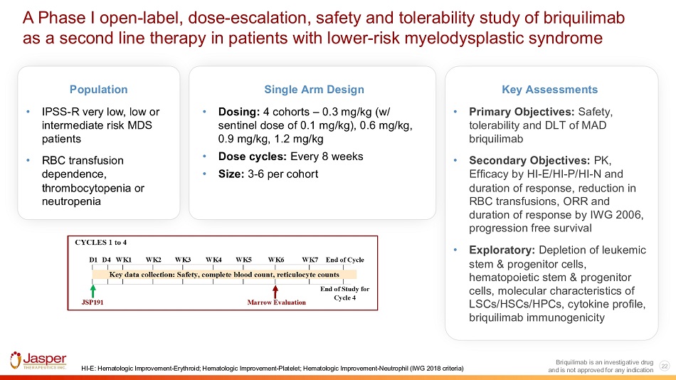 21 Briquilimab is an investigative drug and is not approved for any indication Briquilimab depletion may enable healthy HSCs to take over the bone marrow niche and restore functional hematopoiesis 1 Kwon et al, Blood 2019 2 Amgen Phase I healthy volunteer data (unpublished) Briquilimab depletion and rebound of healthy HSCs 2 Reticulocytes MDS cells are depleted and stay depleted Healthy HSCs are depleted, recover and expand Human MDS chimerismin BM 25% 20% 15% 10% 5% 0% d0 d21 12 weeks * * MDS 5 MDS 5 MDS 3 MDS 3 MDS 6 MDS 6 Briquilimab lasting depletion of MDS cells in Xenograft model 1 30%