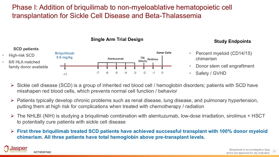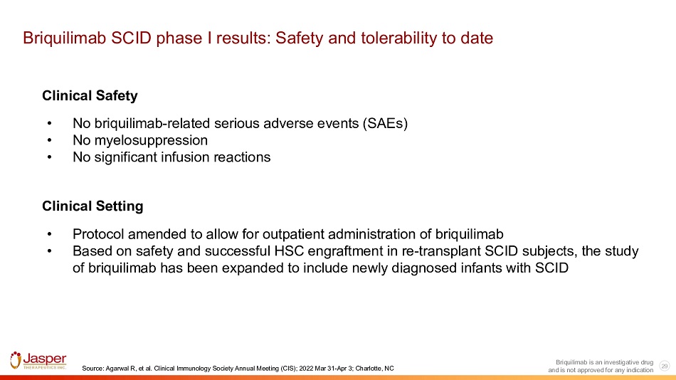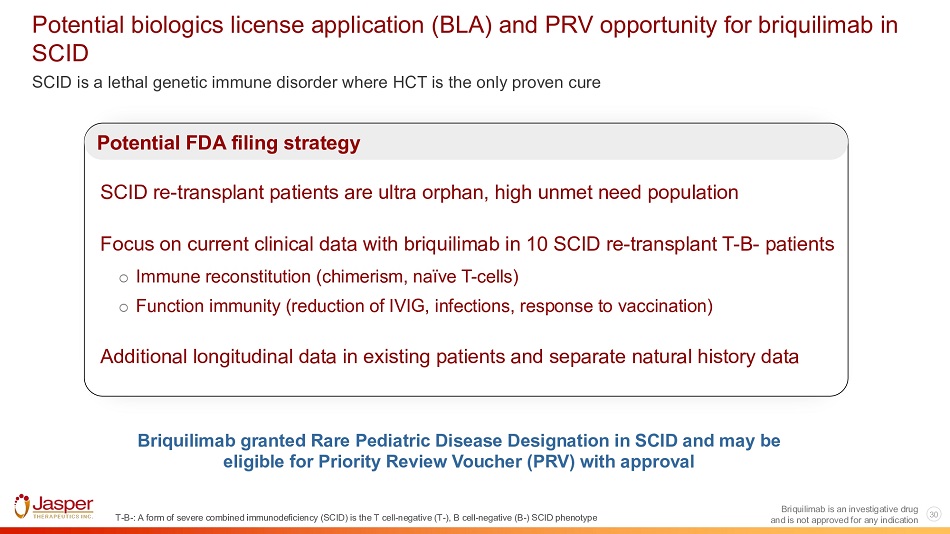 28 Briquilimab is an investigative drug Briquilimab conditioning for severe combined immunodeficiency (SCID) T - B - : A form of severe combined immunodeficiency (SCID) is the T cell - negative (T - ), B cell - negative (B - ) SCID phenotype Jasper SCID Strategy: • Establish Single Agent Activity POC • Focus on Re - transplant T - B - Subjects • FDA Supportive of Ultra - Orphan Data Package • Potential Priority Review Voucher and is not approved for any indication