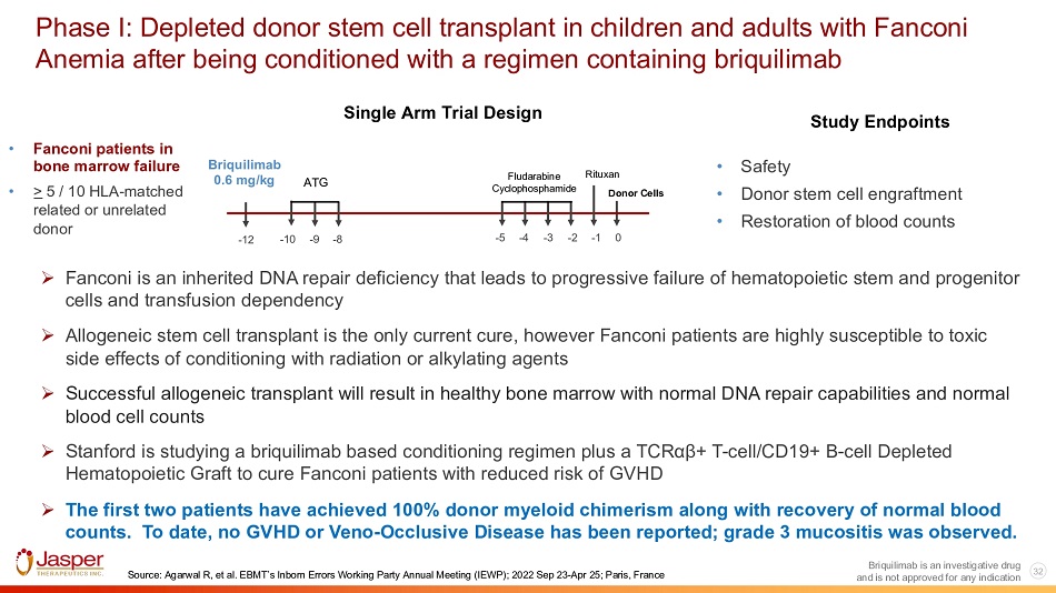 32 Briquilimab is an investigative drug Fludarabine Cyclophosphamide ► Fanconi is an inherited DNA repair deficiency that leads to progressive failure of hematopoietic stem and progenitor cells and transfusion dependency ► Allogeneic stem cell transplant is the only current cure, however Fanconi patients are highly susceptible to toxic side effects of conditioning with radiation or alkylating agents ► Successful allogeneic transplant will result in healthy bone marrow with normal DNA repair capabilities and normal blood cell counts ► Stanford is studying a briquilimab based conditioning regimen plus a TCRαβ+ T - cell/CD19+ B - cell Depleted Hematopoietic Graft to cure Fanconi patients with reduced risk of GVHD ► The first two patients have achieved 100% donor myeloid chimerism along with recovery of normal blood counts. To date, no GVHD or Veno - Occlusive Disease has been reported; grade 3 mucositis was observed. • Fanconi patients in bone marrow failure • > 5 / 10 HLA - matched related or unrelated donor • Safety • Donor stem cell engraftment • Restoration of blood counts Study Endpoints Single Arm Trial Design - 5 - 4 - 3 - 2 - 1 0 - 12 - 10 - 9 - 8 Briquilimab 0.6 mg/kg and is not approved for any indication ATG Rituxan Donor Cells Source: Agarwal R, et al. EBMT’s Inborn Errors Working Party Annual Meeting (IEWP); 2022 Sep 23 - Apr 25; Paris, France Phase I: Depleted donor stem cell transplant in children and adults with Fanconi Anemia after being conditioned with a regimen containing briquilimab