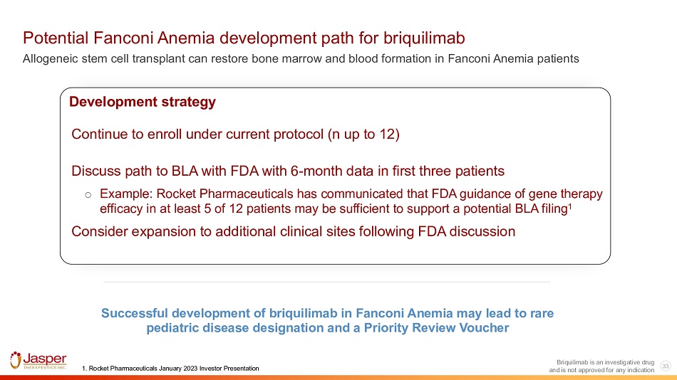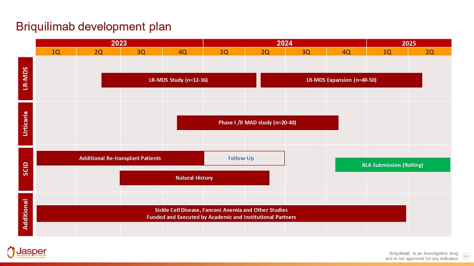 33 Briquilimab is an investigative drug Potential Fanconi Anemia development path for briquilimab Allogeneic stem cell transplant can restore bone marrow and blood formation in Fanconi Anemia patients Development strategy Continue to enroll under current protocol (n up to 12) Discuss path to BLA with FDA with 6 - month data in first three patients o Example: Rocket Pharmaceuticals has communicated that FDA guidance of gene therapy efficacy in at least 5 of 12 patients may be sufficient to support a potential BLA filing 1 Consider expansion to additional clinical sites following FDA discussion Successful development of briquilimab in Fanconi Anemia may lead to rare pediatric disease designation and a Priority Review Voucher 1. Rocket Pharmaceuticals January 2023 Investor Presentation and is not approved for any indication