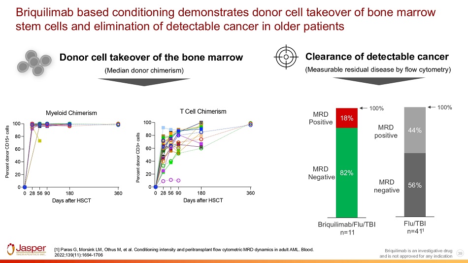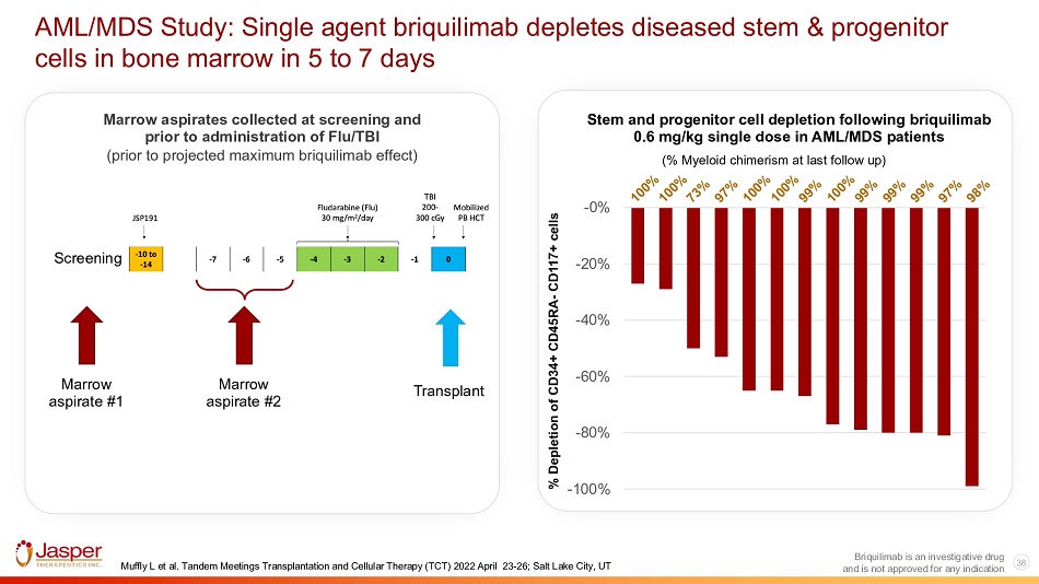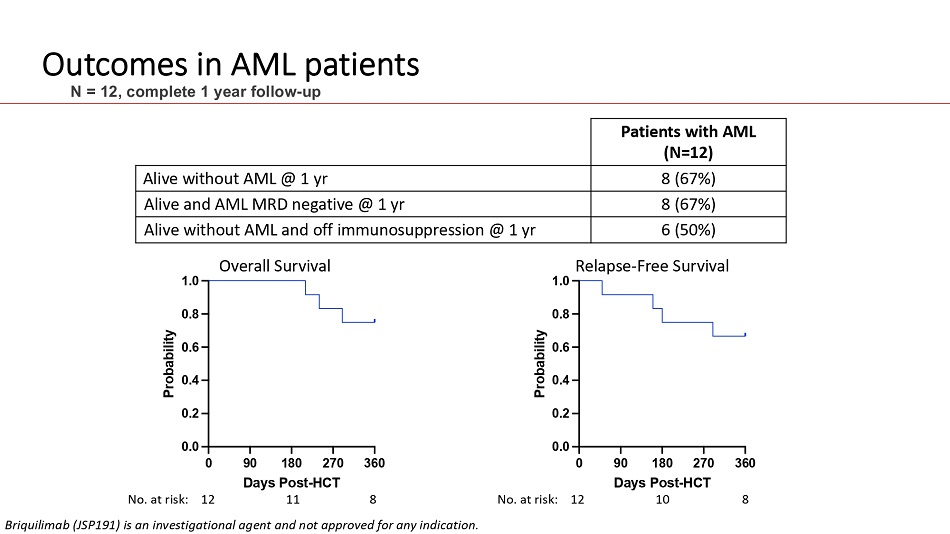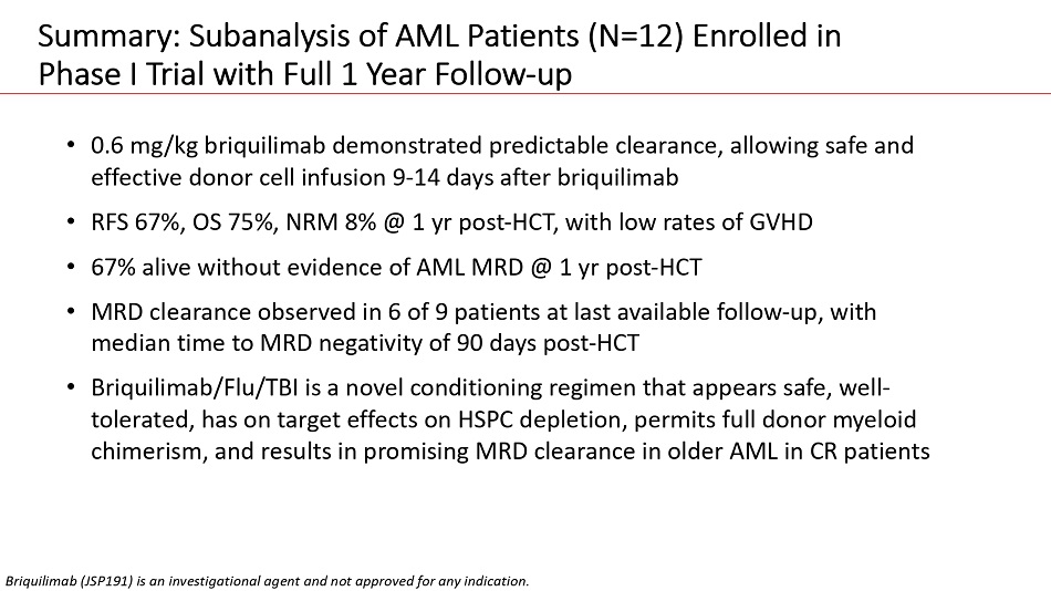 Summary: Subanalysis of AML Patients (N=12) Enrolled in Phase I Trial with Full 1 Year Follow - up • 0.6 mg/kg briquilimab demonstrated predictable clearance, allowing safe and effective donor cell infusion 9 - 14 days after briquilimab • RFS 67%, OS 75%, NRM 8% @ 1 yr post - HCT, with low rates of GVHD • 67% alive without evidence of AML MRD @ 1 yr post - HCT • MRD clearance observed in 6 of 9 patients at last available follow - up, with median time to MRD negativity of 90 days post - HCT • Briquilimab/Flu/TBI is a novel conditioning regimen that appears safe, well - tolerated, has on target effects on HSPC depletion, permits full donor myeloid chimerism, and results in promising MRD clearance in older AML in CR patients Briquilimab (JSP191) is an investigational agent and not approved for any indication.