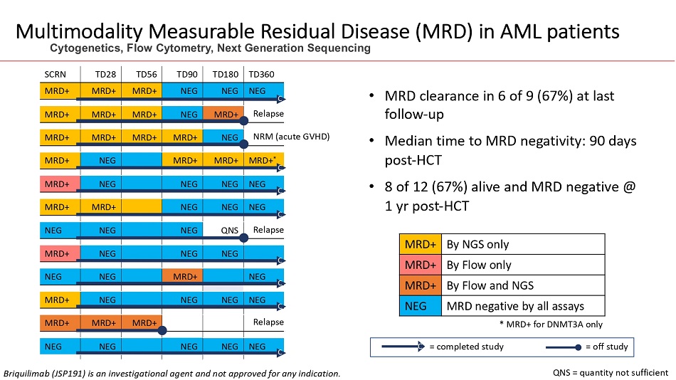 TD360 TD180 TD90 TD56 TD28 SCRN NEG C NEG NEG MRD+ MRD+ MRD+ Relapse MRD+ NEG MRD+ MRD+ MRD+ NRM (acu NEG MRD+ MRD+ MRD+ MRD+ MRD+ * C MRD+ MRD+ NEG MRD+ NEG C NEG NEG NEG MRD+ NEG C NEG NEG MRD+ MRD+ Relapse QNS NEG NEG NEG C NEG NEG NEG MRD+ NEG C MRD+ NEG NEG NEG C NEG NEG NEG MRD+ Relapse MRD+ MRD+ MRD+ NEG C NEG NEG NEG NEG Multimodality Measurable Residual Disease (MRD) in AML patients Cytogenetics, Flow Cytometry, Next Generation Sequencing Briquilimab (JSP191) is an investigational agent and not approved for any indication. QNS = quantity not sufficient C = completed study = off study * MRD+ for DNMT3A only te GVHD) By NGS only MRD+ By Flow only MRD+ By Flow and NGS MRD+ MRD negative by all assays NEG • MRD clearance in 6 of 9 (67%) at last follow - up • Median time to MRD negativity: 90 days post - HCT • 8 of 12 (67%) alive and MRD negative @ 1 yr post - HCT