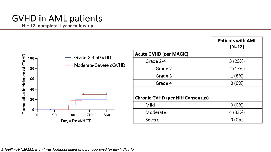 GVHD in AML patients N = 12, complete 1 year follow - up Patients with AML (N=12) Acute GVHD (per MAGIC) 3 (25%) Grade 2 - 4 2 (17%) Grade 2 1 (8%) Grade 3 0 (0%) Grade 4 Chronic GVHD (per NIH Consensus) 0 (0%) Mild 4 (33%) Moderate 0 (0%) Severe Grade 2 - 4 aGVHD Moderate - Severe cGVHD 0 Briquilimab (JSP191) is an investigational agent and not approved for any indication. 90 180 270 Days Post - HCT 360 60 40 20 0 80 100 Cumulative Incidence of GVHD