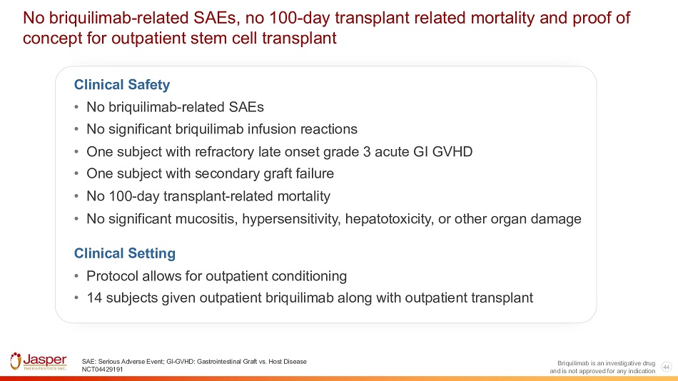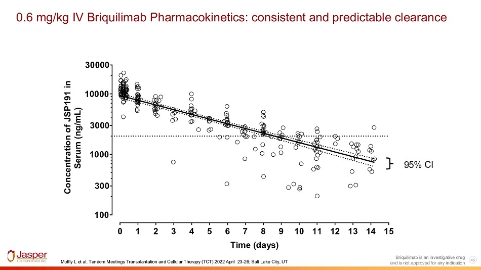 44 Briquilimab is an investigative drug and is not approved for any indication No briquilimab - related SAEs, no 100 - day transplant related mortality and proof of concept for outpatient stem cell transplant Clinical Safety • No briquilimab - related SAEs • No significant briquilimab infusion reactions • One subject with refractory late onset grade 3 acute GI GVHD • One subject with secondary graft failure • No 100 - day transplant - related mortality • No significant mucositis, hypersensitivity, hepatotoxicity, or other organ damage Clinical Setting • Protocol allows for outpatient conditioning • 14 subjects given outpatient briquilimab along with outpatient transplant SAE: Serious Adverse Event; GI - GVHD: Gastrointestinal Graft vs. Host Disease NCT04429191