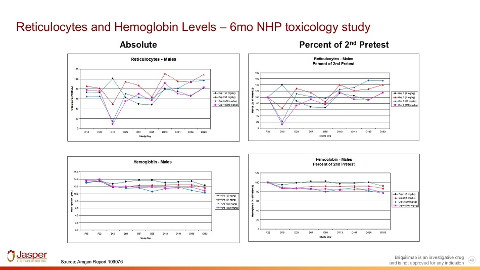 Reticulocytes and Hemoglobin Levels – 6mo NHP toxicology study Briquilimab is an investigative drug and is not approved for any indication 48 Source: Amgen Report 109076