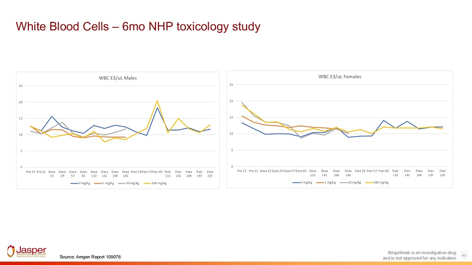White Blood Cells – 6mo NHP toxicology study 0 5 10 15 20 25 WBC E3/uL Males 0 mg/kg 1 mg/kg 30 mg/kg Pre 15 Pre 22 Dose Dose Dose Dose Dose Dose Dose Dose Post 29Post 57Post 85 Post Post Pose Post Post 15 29 57 85 113 141 169 183 113 141 169 197 225 300 mg/kg 0 5 10 15 20 25 Pre 15 Pre 22 Dose 15 Dose 29 Dose 57 Dose 85 Dose Dose Dose Dose Post 29 Post 57 Post 85 Post Post Pose Post Post 113 141 169 197 225 WBC E3/uL Females 113 141 169 183 0 mg/kg 1 mg/kg 30 mg/kg 300 mg/kg Briquilimab is an investigative drug and is not approved for any indication 49 Source: Amgen Report 109076