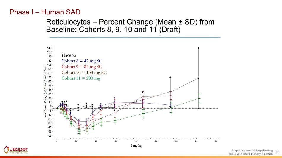 * All mild (Grade 1) AEs except for two Grade 2 events Briquilimab is an investigative drug and is not approved for any indication 51 Briquilimab (JSP191/AMG191) Phase I SAD Study: Adverse events of interest