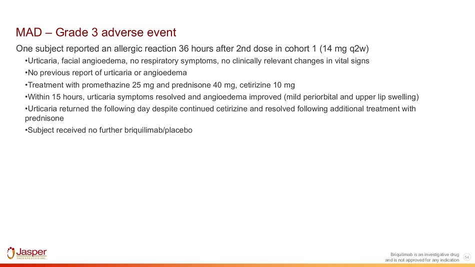 Phase I – Human SAD Study Day Briquilimab is an investigative drug and is not approved for any indication 53