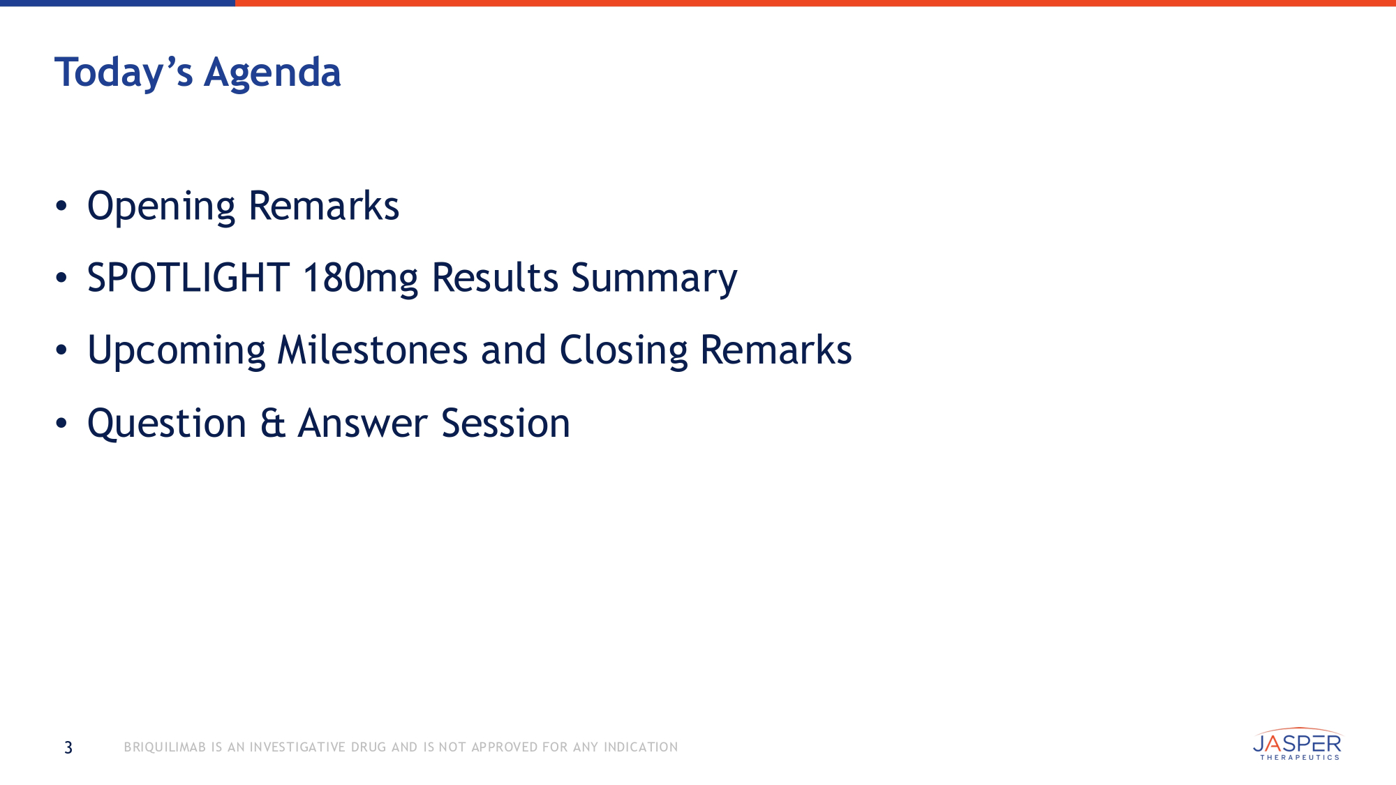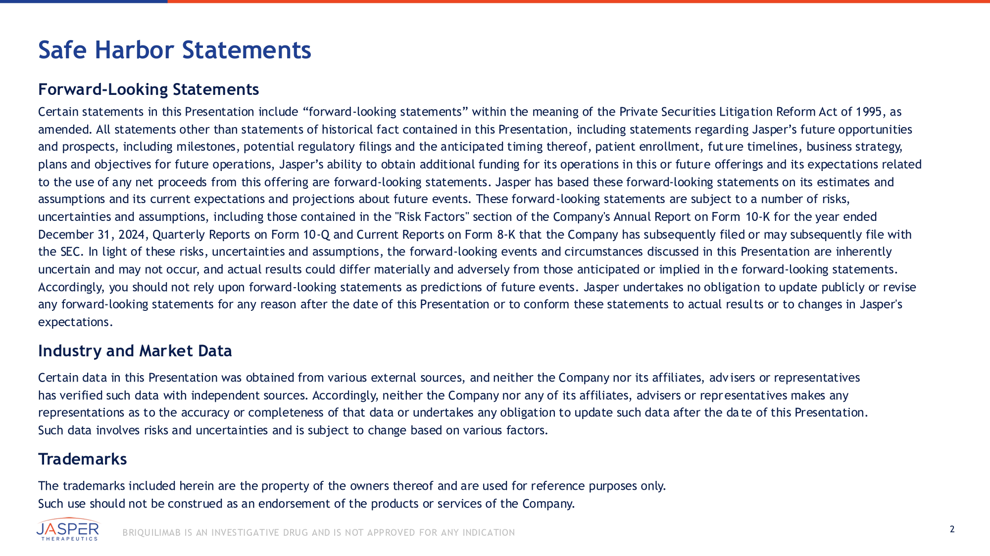 2 B RIQU ILIMAB IS AN INVES TIGATIVE DRU G AND IS NOT APPROVED FOR ANY INDICATION Safe Harbor Statements Forward - Looking Statements Certain statements in this Presentation include “forward - looking statements” within the meaning of the Private Securities Litigation Reform Act of 1995, as amended. All statements other than statements of historical fact contained in this Presentation, including statements regarding Jasper’s future opportunities and prospects, including milestones, potential regulatory filings and the anticipated timing thereof, patient enrollment, future timelines, business strategy, plans and objectives for future operations, Jasper’s ability to obtain additional funding for its operations in this or future offerings and its expectations related to the use of any net proceeds from this offering are forward - looking statements. Jasper has based these forward - looking statements on its estimates and assumptions and its current expectations and projections about future events. These forward - looking statements are subject to a number of risks, uncertainties and assumptions, including those contained in the "Risk Factors" section of the Company's Annual Report on Form 10 - K for the year ended December 31, 2024, Quarterly Reports on Form 10 - Q and Current Reports on Form 8 - K that the Company has subsequently filed or may subsequently file with the SEC. In light of these risks, uncertainties and assumptions, the forward - looking events and circumstances discussed in this Presentation are inherently uncertain and may not occur, and actual results could differ materially and adversely from those anticipated or implied in th e forward - looking statements. Accordingly, you should not rely upon forward - looking statements as predictions of future events. Jasper undertakes no obligation to update publicly or revise any forward - looking statements for any reason after the date of this Presentation or to conform these statements to actual results or to changes in Jasper's expectations. Industry and Market Data Certain data in this Presentation was obtained from various external sources, and neither the Company nor its affiliates, adv isers or representatives has verified such data with independent sources. Accordingly, neither the Company nor any of its affiliates, advisers or representatives makes any representations as to the accuracy or completeness of that data or undertakes any obligation to update such data after the date of this Presentation. Such data involves risks and uncertainties and is subject to change based on various factors. Trademarks The trademarks included herein are the property of the owners thereof and are used for reference purposes only. Such use should not be construed as an endorsement of the products or services of the Company.