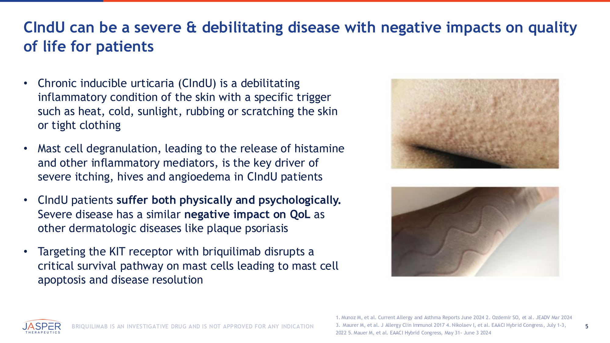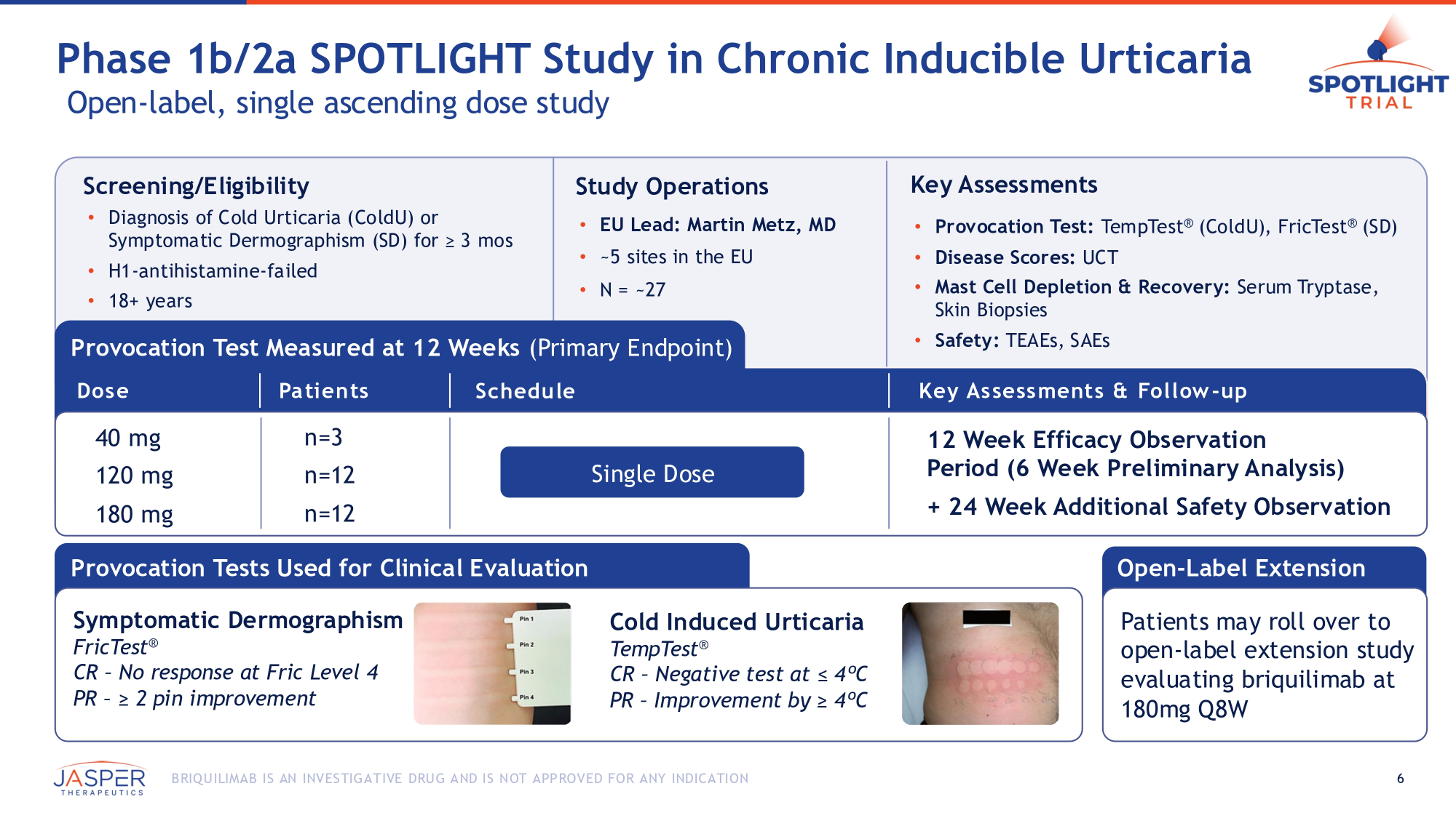 5 BRIQUILIMAB IS AN INVESTIGATIVE DRUG AND IS NOT APPROVED FOR ANY INDICATION CIndU can be a severe & debilitating disease with negative impacts on quality of life for patients • Chronic inducible urticaria (CIndU) is a debilitating inflammatory condition of the skin with a specific trigger such as heat, cold, sunlight, rubbing or scratching the skin or tight clothing • Mast cell degranulation, leading to the release of histamine and other inflammatory mediators, is the key driver of severe itching, hives and angioedema in CIndU patients • CIndU patients suffer both physically and psychologically. Severe disease has a similar negative impact on QoL as other dermatologic diseases like plaque psoriasis • Targeting the KIT receptor with briquilimab disrupts a critical survival pathway on mast cells leading to mast cell apoptosis and disease resolution 1. Munoz M, et al. Current Allergy and Asthma Reports June 2024 2. Ozdemir SO, et al. JEADV Mar 2024 3. Maurer M, et al. J Allergy Clin Immunol 2017 4. Nikolaev I, et al. EAACI Hybrid Congress, July 1 - 3, 2022 5. Mauer M, et al. EAACI Hybrid Congress, May 31 - June 3 2024