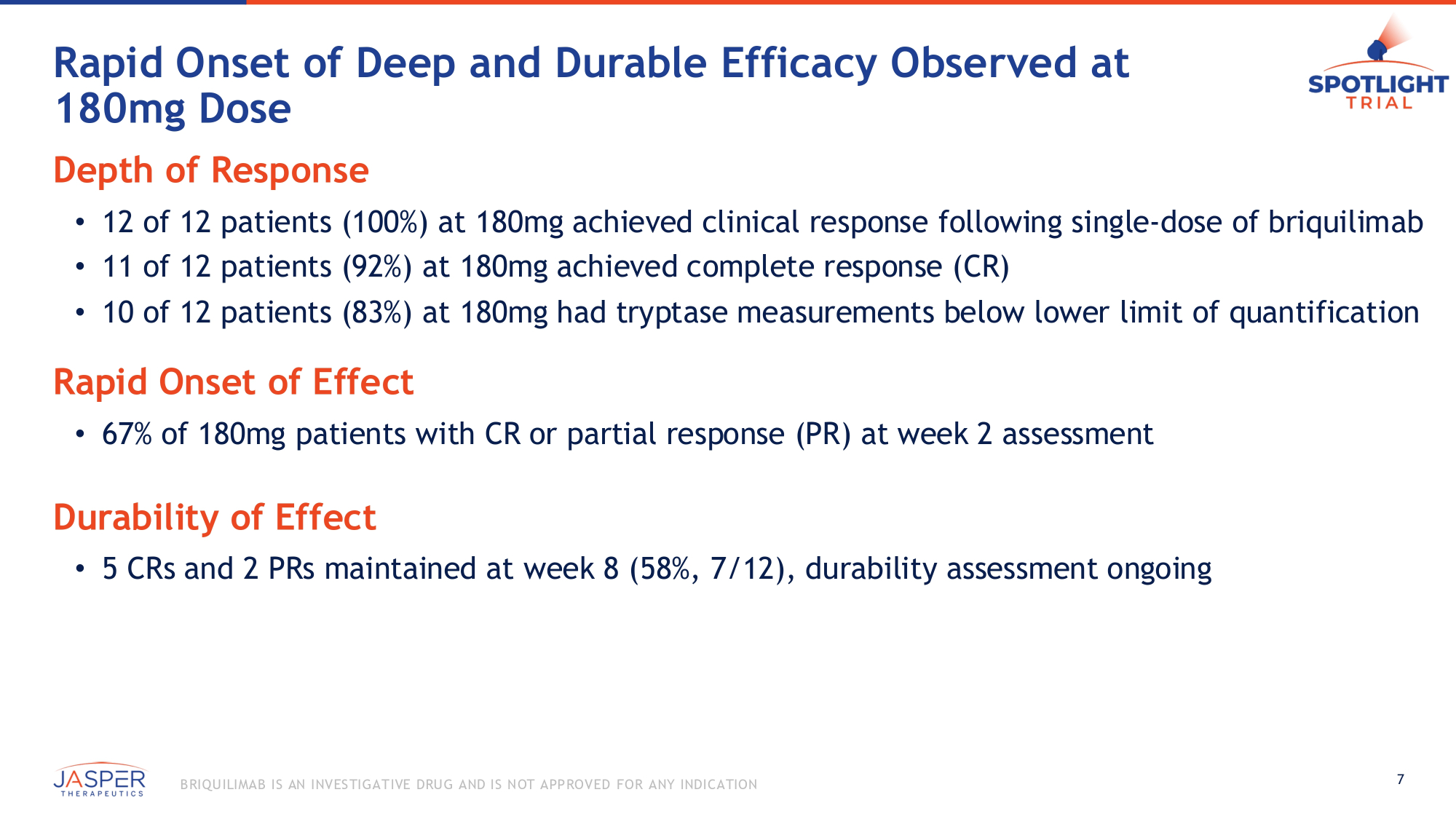 Screening/Eligibility • Diagnosis of Cold Urticaria (ColdU) or Symptomatic Dermographism (SD) for ≥ 3 mos • H1 - antihistamine - failed • 18+ years • 18 - 65 years of age Study Operations • EU Lead: Martin Metz, MD • ~5 sites in the EU • N = ~27 Key Assessments • Provocation Test: TempTest ® (ColdU), FricTest ® (SD) • Disease Scores: UCT • Mast Cell Depletion & Recovery: Serum Tryptase, Skin Biopsies • Safety: TEAEs, SAEs Provocation Test Measured at 12 Weeks (Primary Endpoint) Provocation Tests Used for Clinical Evaluation 40 mg 120 mg 180 mg n=3 n=12 n=12 Symptomatic Dermographism FricTest ® CR – No response at Fric Level 4 PR – ≥ 2 pin improvement Cold Induced Urticaria TempTest ® CR – Negative test at ≤ 4ºC PR – Improvement by ≥ 4ºC Single Dose Dose Patients Schedule Key Assessments & Follow - up 12 Week Efficacy Observation Period (6 Week Preliminary Analysis) + 24 Week Additional Safety Observation Phase 1b/2a SPOTLIGHT Study in Chronic Inducible Urticaria Open - label, single ascending dose study Open - Label Extension 6 B RIQU ILIMAB IS AN INVES TIGATIVE DRU G AND IS NOT APPROVED FOR ANY INDICATION Patients may roll over to open - label extension study evaluating briquilimab at 180mg Q8W