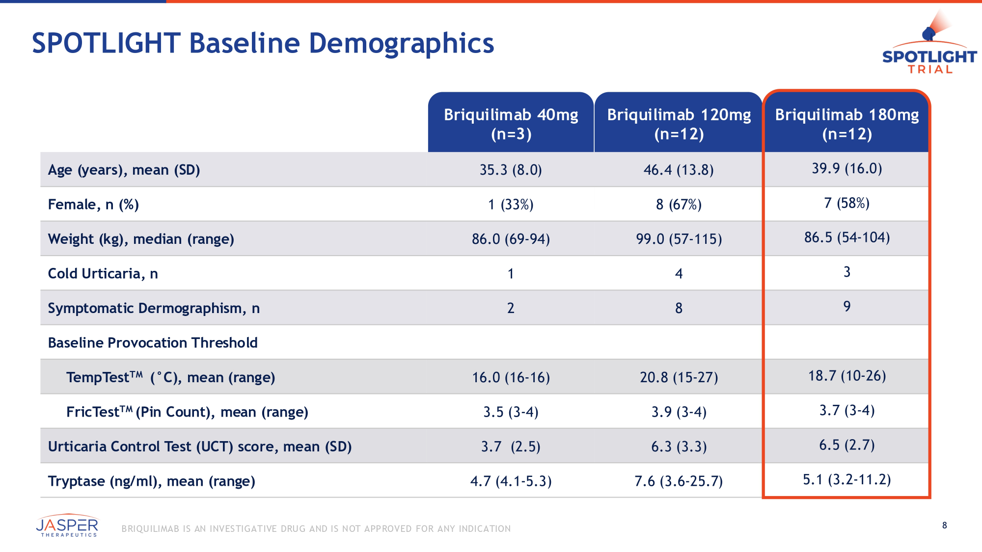 Rapid Onset of Deep and Durable Efficacy Observed at 180mg Dose 7 B RIQU ILIMAB IS AN INVES TIGATIVE DRU G AND IS NOT APPROVED FOR ANY INDICATION Depth of Response • 12 of 12 patients (100%) at 180mg achieved clinical response following single - dose of briquilimab • 11 of 12 patients (92%) at 180mg achieved complete response (CR) • 10 of 12 patients (83%) at 180mg had tryptase measurements below lower limit of quantification Rapid Onset of Effect • 67% of 180mg patients with CR or partial response (PR) at week 2 assessment Durability of Effect • 5 CRs and 2 PRs maintained at week 8 (58%, 7/12), durability assessment ongoing